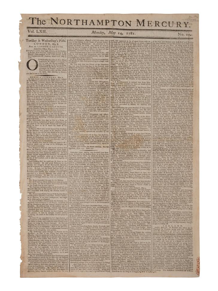 [REVOLUTIONARY WAR - BATTLE OF GUILFORD COURT HOUSE]. Northampton Mercury. Vol. LXII, No. 10. London, England: Thomas Dicey & Co., 14 May 1781. $600 - 800