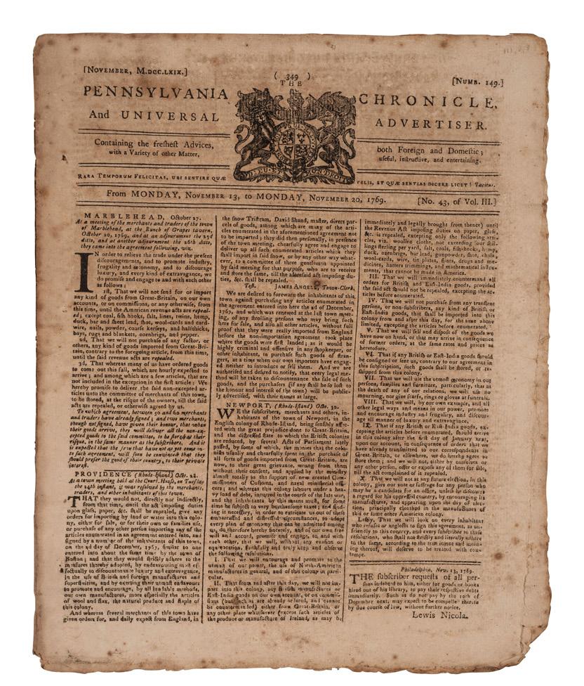 6 [NONIMPORTATION AGREEMENTS]. Pennsylvania Chronicle and Universal Advertiser. Vol. III, No. 43. Philadelphia, PA: William Goddard and Benjamin Towne, 20 November 1769.