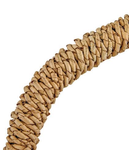 Hand-strung wooden beads hang from a frame, hand-wrapped in natural fiber jute rope.