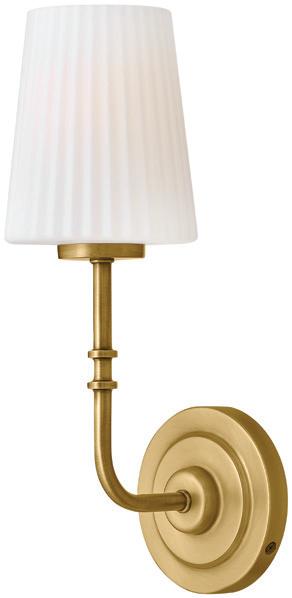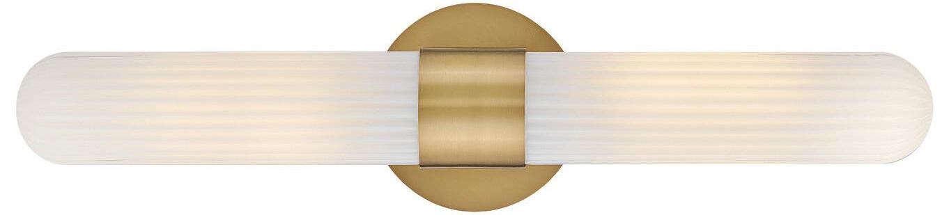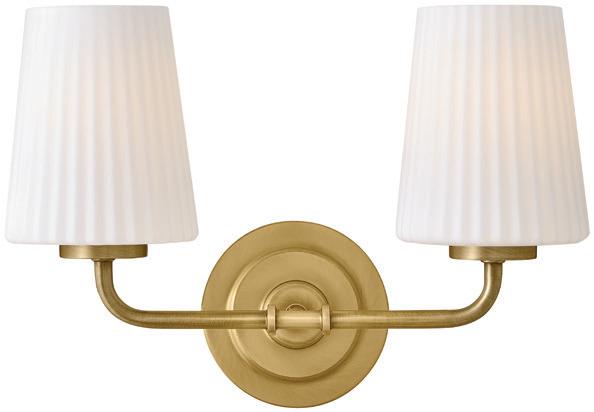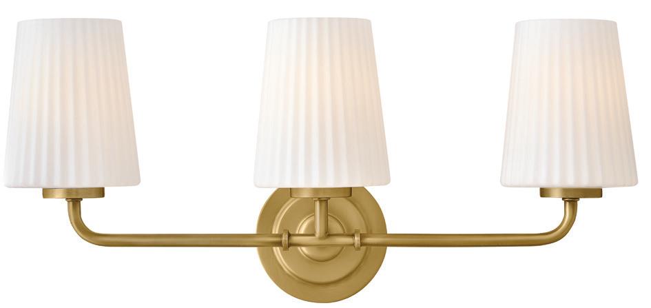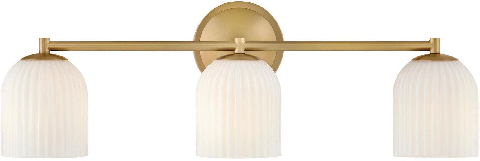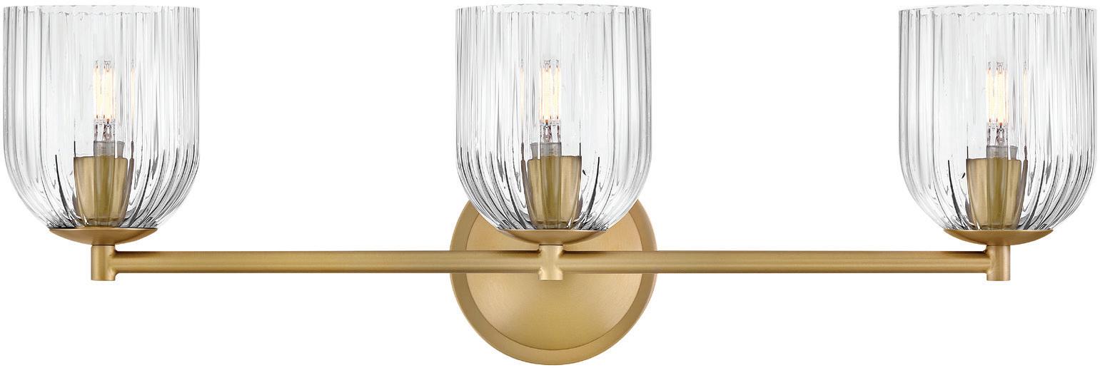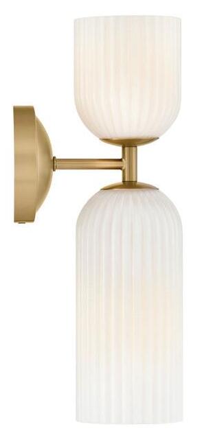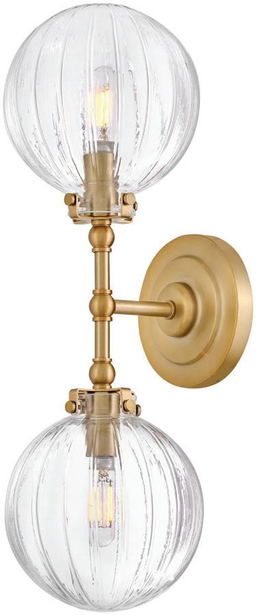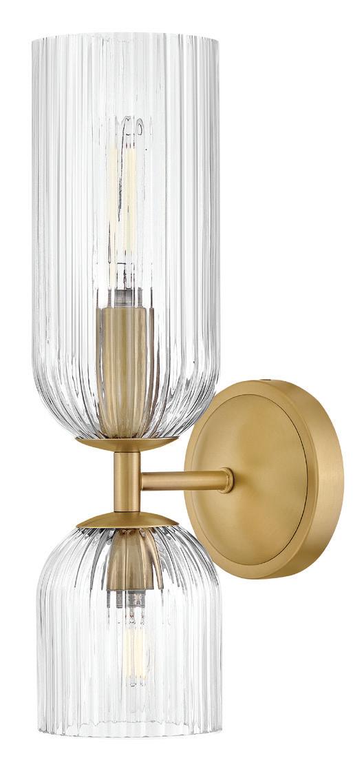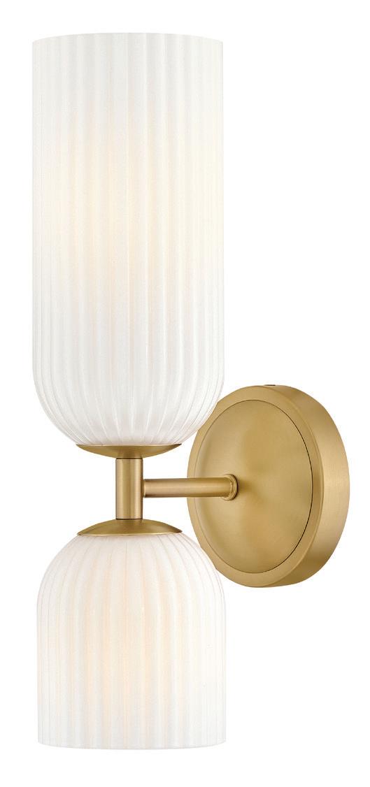 The graceful curves of Ava’s transitional ribbed glass shades are balanced by a sleek silhouette and stepped backplate. A hand-painted Lacquered Brass finish complements the Clear or Cased Opal glass with warm metallic tones, creating a timeless look that complements any décor style.