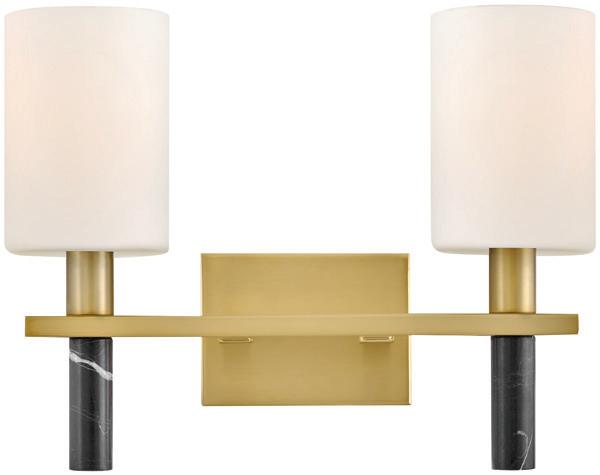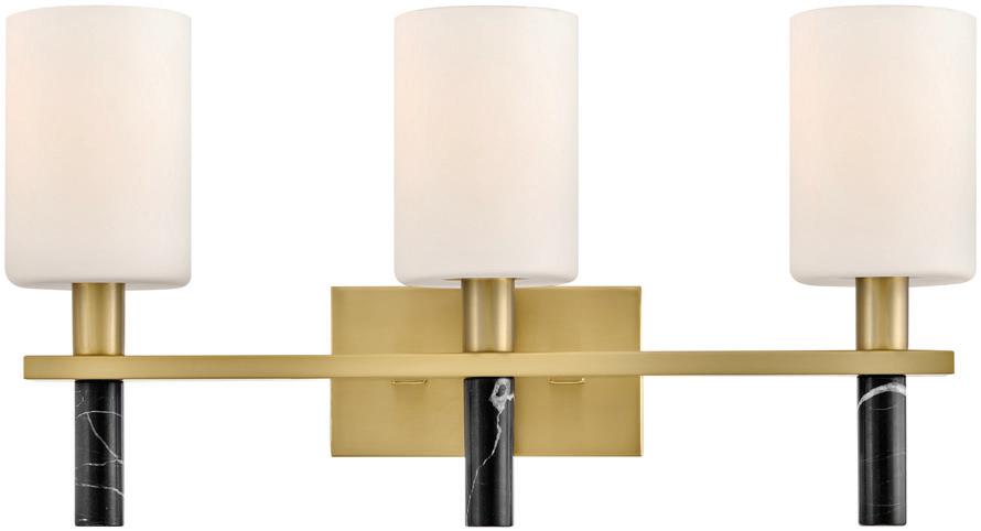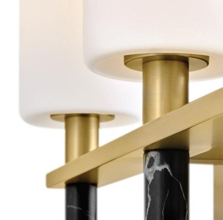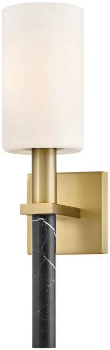 Polished with an understated silhouette, Turin is elevated by tall Etched Opal glass and luxurious black marble stems. A minimalist backplate finished in vibrant Lacquered Brass complements the natural stone with an elegant touch of warm color.