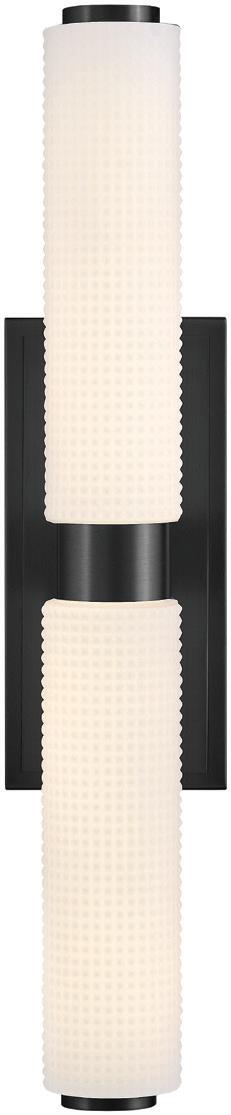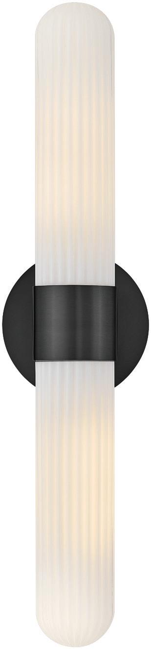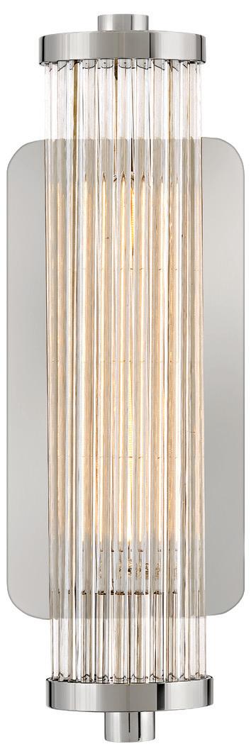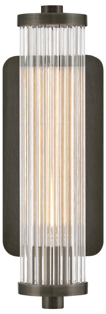 A touch of modern style and vintage charm, Ellery’s Clear glass shade is composed of tall cylindrical glass rods, creating a beautiful reeded effect when illuminated. A large rectangular backplate and matching end caps are finished in a Black Oxide, Heritage Brass, or Polished Nickel finish that complements any bath or living space.