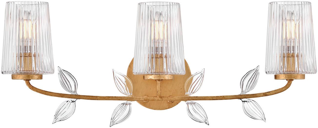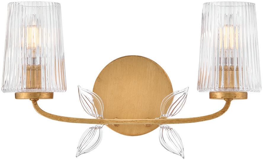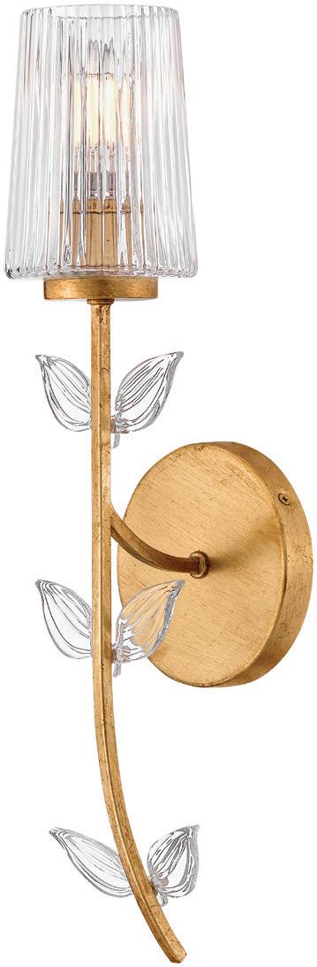 Feminine and romantic, Aliso’s thin, delicate frame is adorned with dainty, clear, pressed glass leaves. A hand-painted Distressed Brass finish enhanced by gold leaf makes a polished and luxurious statement in both traditional and modern settings