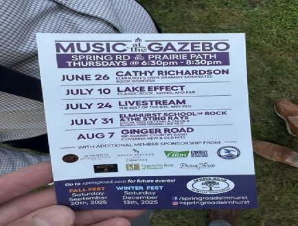 The Spring Road Business Association’s Music at the Gazebo celebrated its 23rd season, offering free Thursday evening concerts from June 12–August 7 in Elmhurst. The lineup featured rock, country, jazz, pop, and more in a familyfriendly outdoor setting. Attendees brought picnics, chairs, and blankets for an unforgettable community experience.