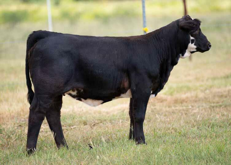This black baldy purebred Simmental is the epitome of what we try to produce at Hagan Cattle. Superior genetic package with elite phenotype. If I could design a heifer that I wanted to feed for Riggin in 8 years to win a big heifer show I would make her just like this one. She has got everything a guy can ask for, long skinny necked, massive bellied and when viewed from behind you will not be disappointed. She is so powerfully made but yet still has that extra set and flex off both ends it takes to win heifer shows today. The potential is endless here boys, take advantage! 21 PHANTOM REG #: PENDING • DOB: APR-22 BREED: PB SIMMENTAL SIRE: GSC SAVAGE 9G DAM: XTB KEEPSAKE 803H SELLER: HAGAN CATTLE COMPANY SELECT HEIFER SALE • OCTOBER 9, 2022 • 1 PM • BRYAN, TX • CCI.LIVE SIRE OF LOT 22: GSC SAVAGE 9G