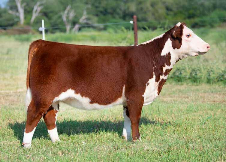 If you’re looking for a big footed, powerful body, big bodied kind that will make a shower heifer or cow, here’s the one! ABSOLUTE COW POWER! Reserving 2 successful flushed out of each lot at buyers convenience and sellers expense. SELECT HEIFER SALE • OCTOBER 9, 2022 • 1 PM • BRYAN, TX • CCI.LIVE 31 BRIGHT MISS KELLY 2217 ET REG #: PENDING • DOB: 3/16/22 BREED: HORNED HEREFORD SIRE: ROLL THE DICE DAM: KELLY 6189 SELLER: LE GRAND - JAMES BRIGHT SIRE OF LOT 31: ROLL THE DICE