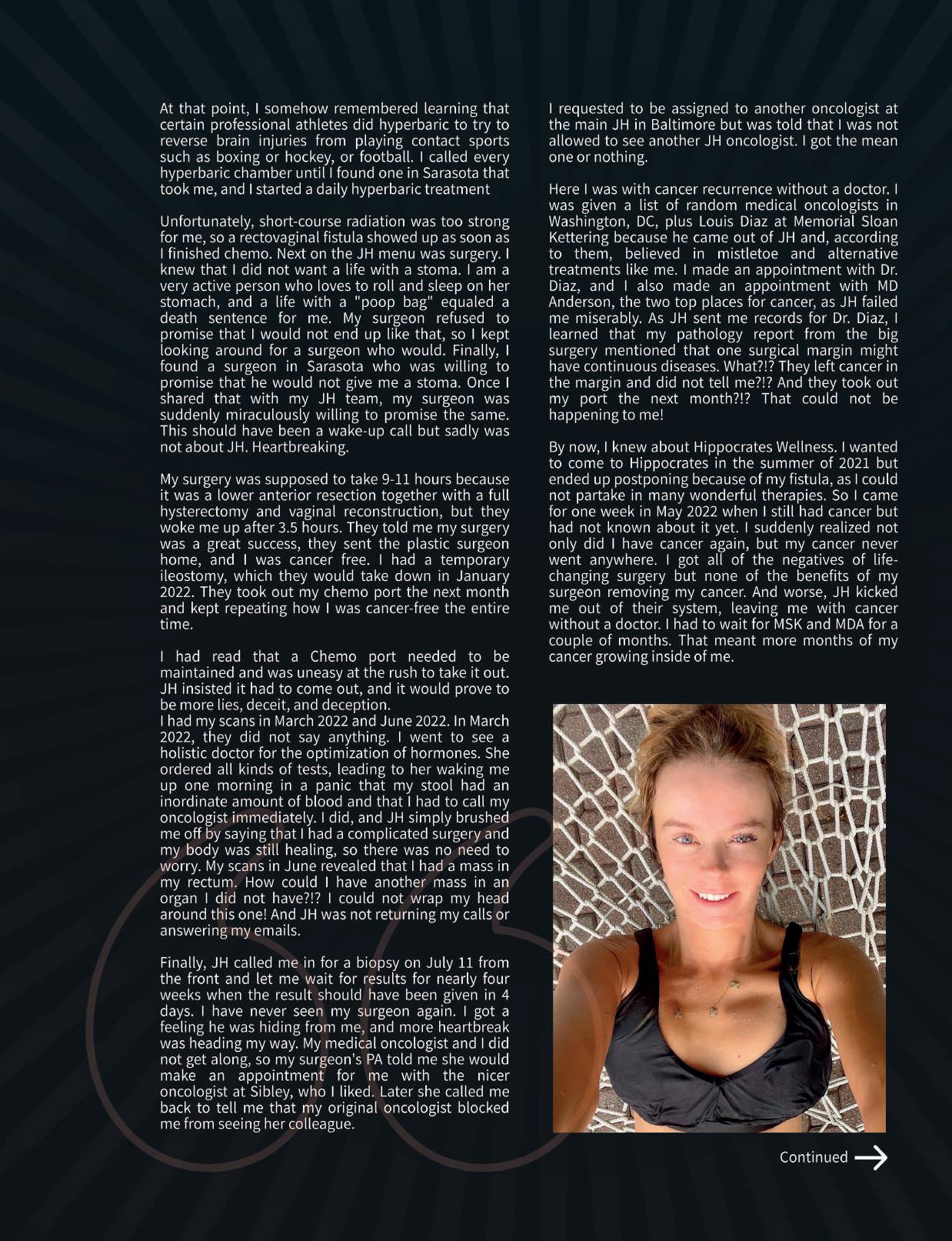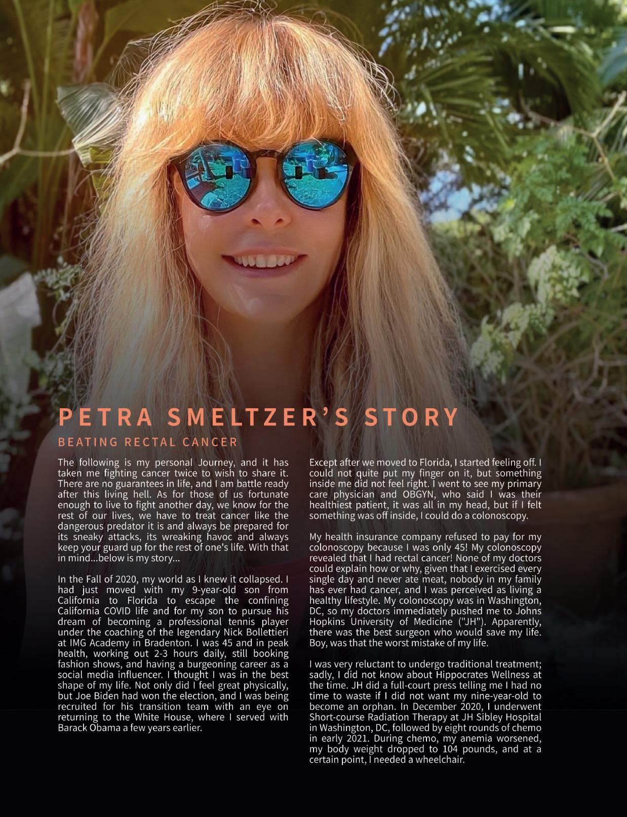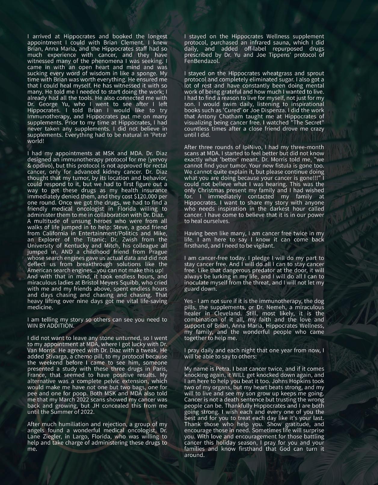 A friend suggested she attend the Hippocrates Comprehensive Cancer Program, and when she arrived, she said, "it was like I landed on a different planet." She recognized that our health professionals and doctors were advising her to live completely the opposite of how she did before. She humbled herself and realized there must be some truth in this. Her second revelation was that the only one who could heal her was herself. That guidance, support, professional advice, and care were only the springboard for her to dive into her life in a way she had never previously attempted. As she began to pursue the tremendous responsibility of self-healing, results began to surface. Her conquest was to banish fear, and with the help of our psychotherapist, she did so. Her taste buds had to be retrained, and she visualized the new healthy food instead of the disease-causing types that made her ill, allowing the ingestion of this wellness cuisine. Step by step, she disassembled the self-destructive lifestyle patterns that nearly killed her, eventually landing on her feet and being diagnosed free of cancer in total remission.