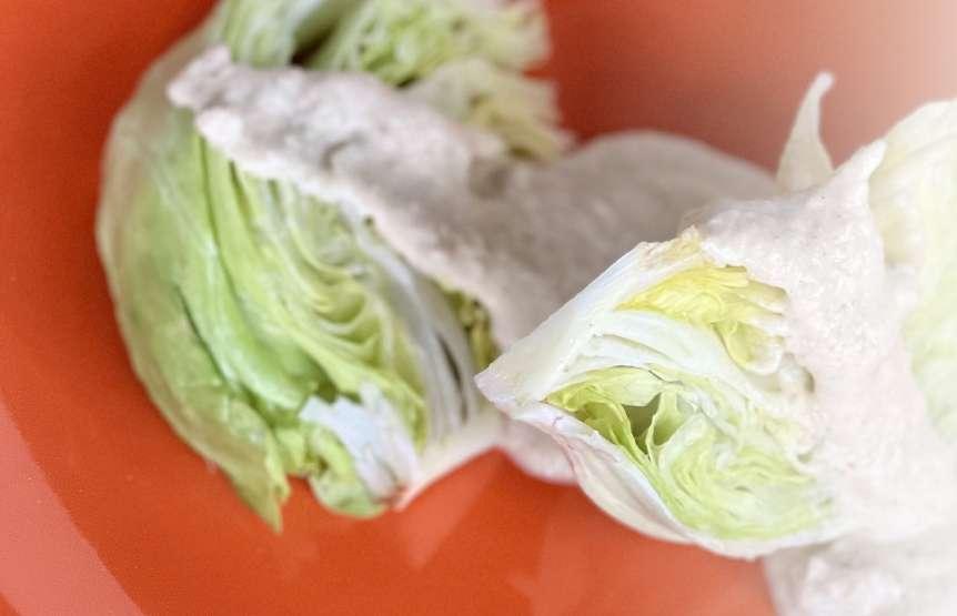 3. Pour over a wedge of iceberg lettuce or cut iceberg smaller and mix with the dressing.