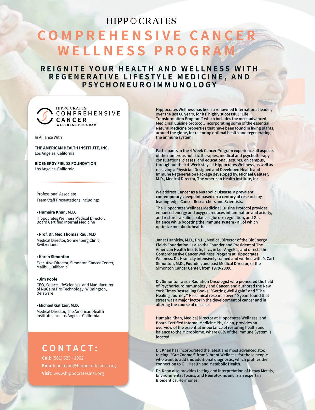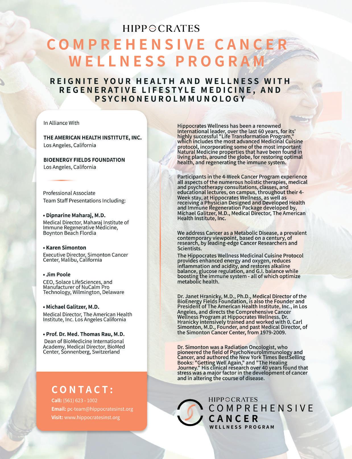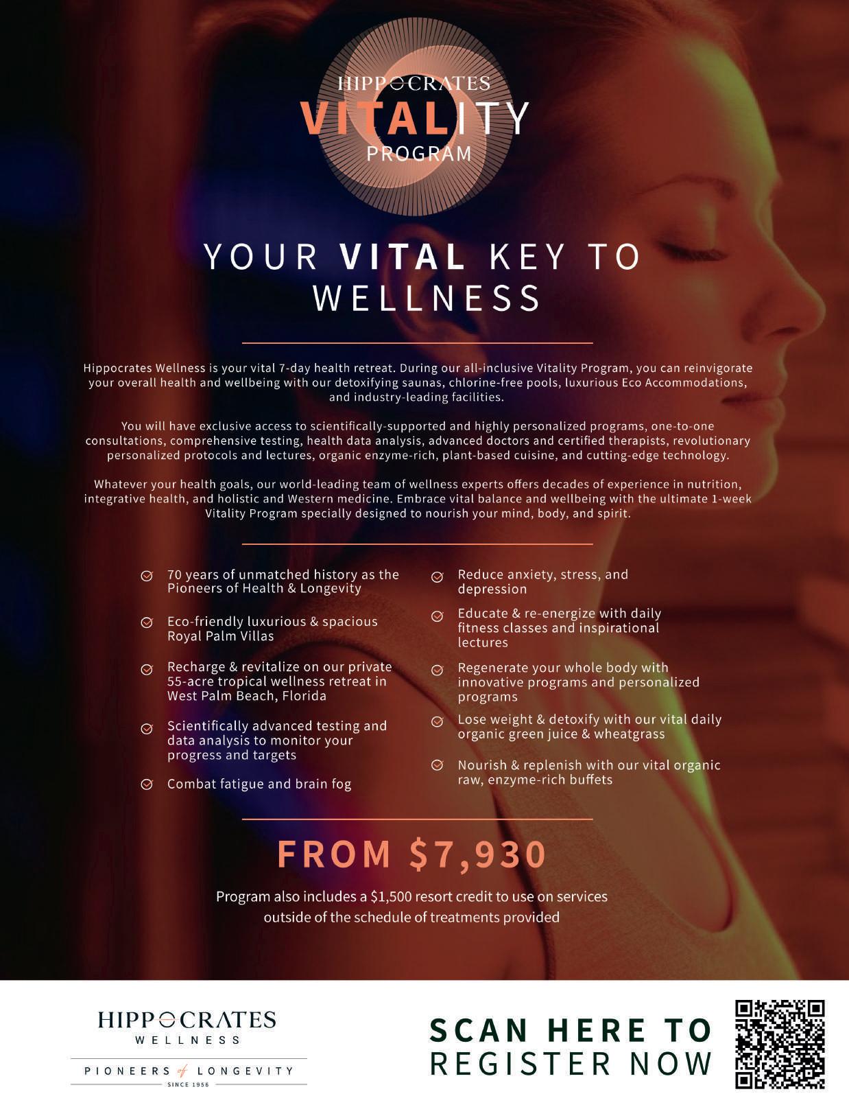 Hippocrates Wellness is not a health care provider. It is a non-profit, tax-exempt organization whose purpose is providing guests and students with progressive information. Hippocrates Wellness and Hippocrates Health Institute of Florida, Inc., Do not provide medicine or medical diagnoses, care, or treatment. Any and all information contained in this magazine is to be construed as opinions. The information herein is not meant to supplant or take the place of your medical treatment, diagnosis, or care. No part of this publication can be reprinted in any form without written permission from the publisher. Unauthorized reproduction in any manner is prohibited.
