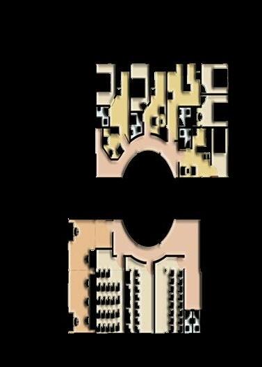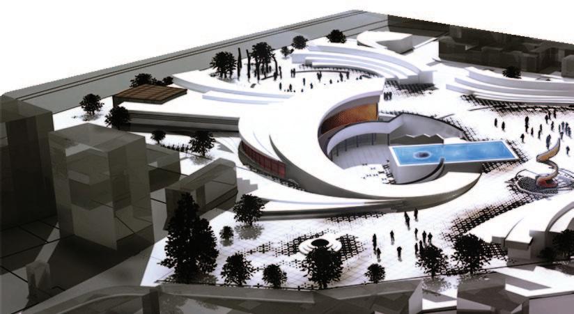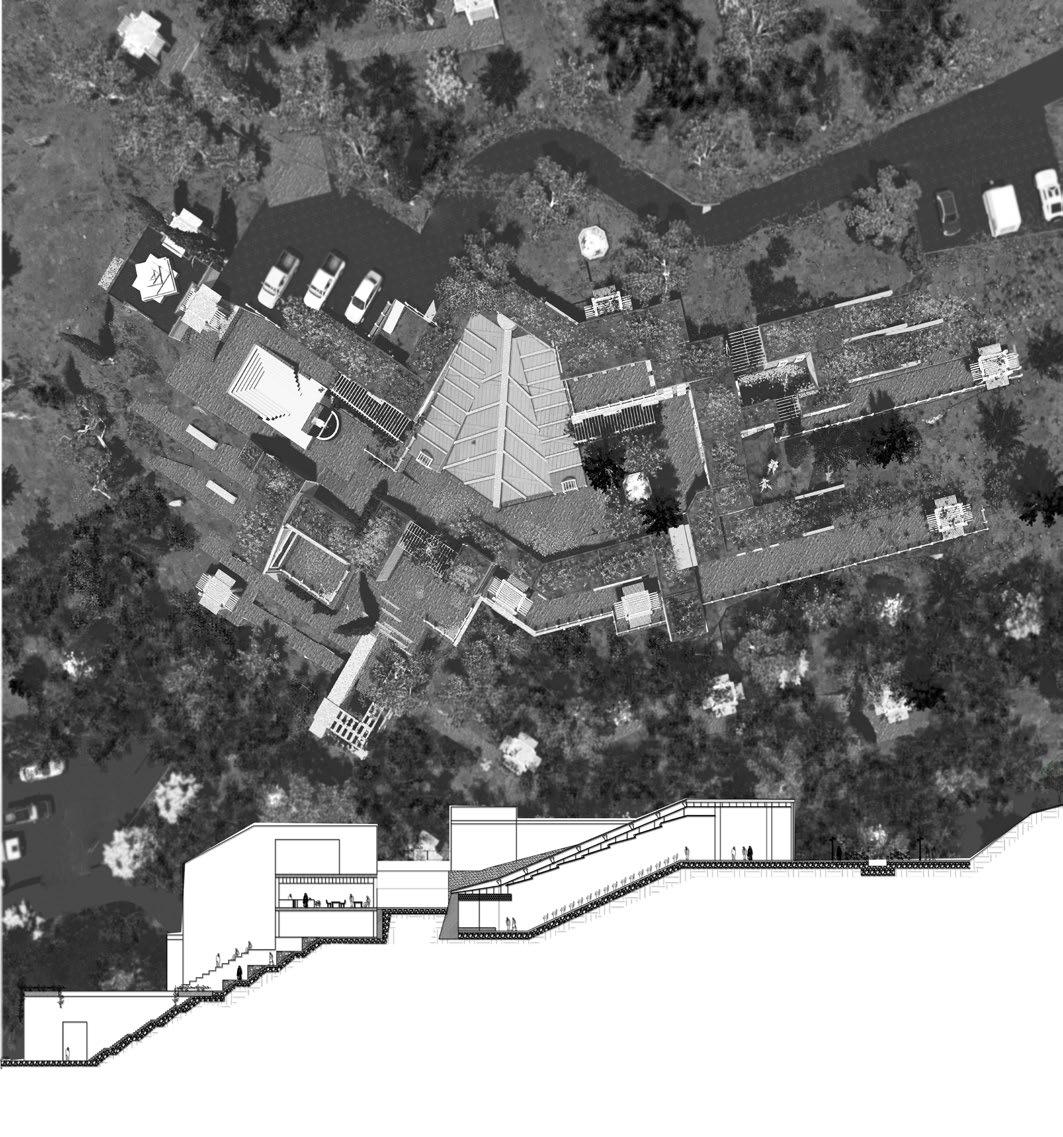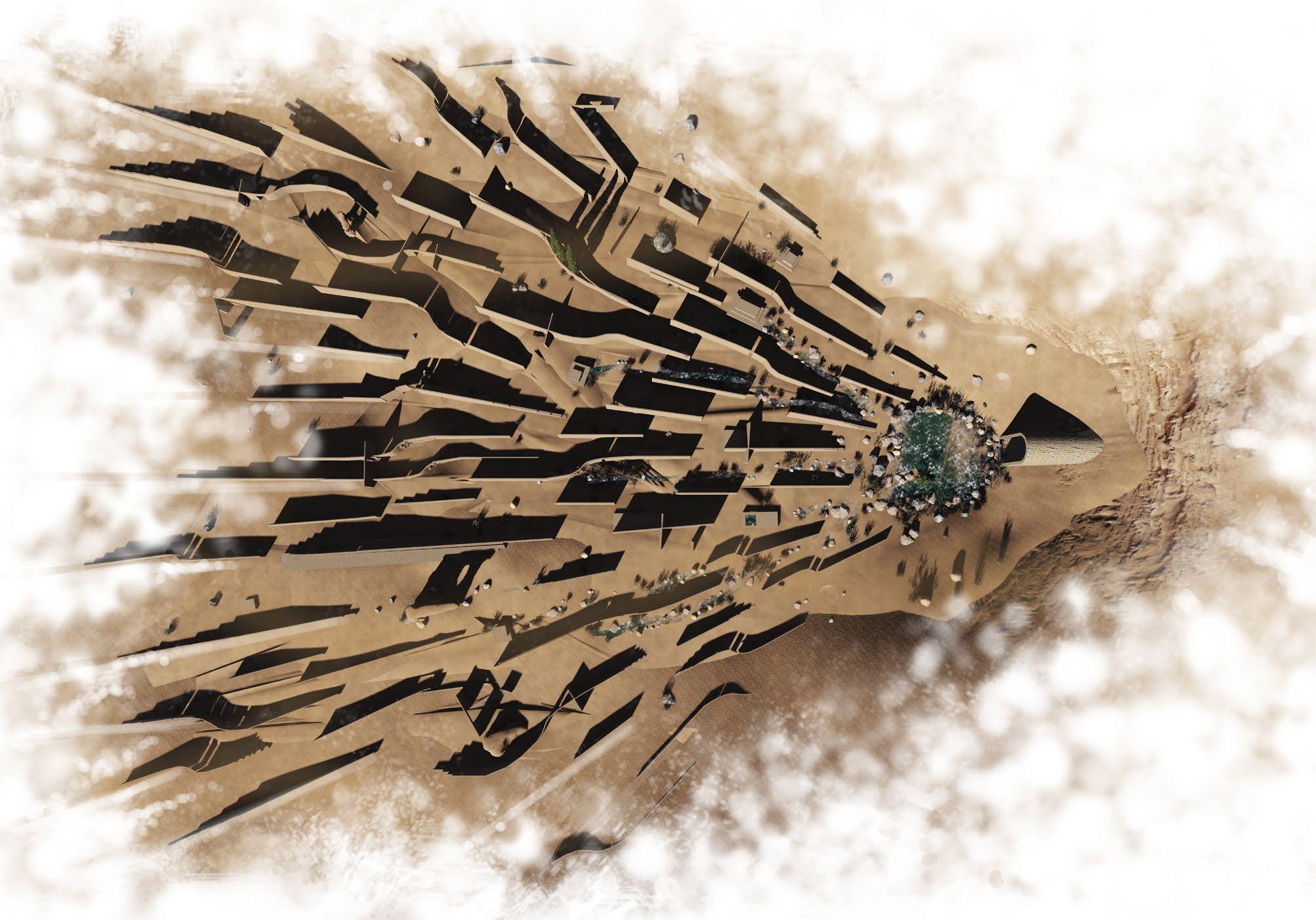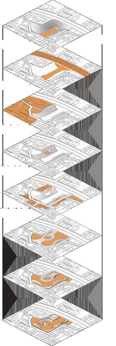 Public plaza on the top with the feeling of the NM’s geologic features like; canyons and tent rocks.