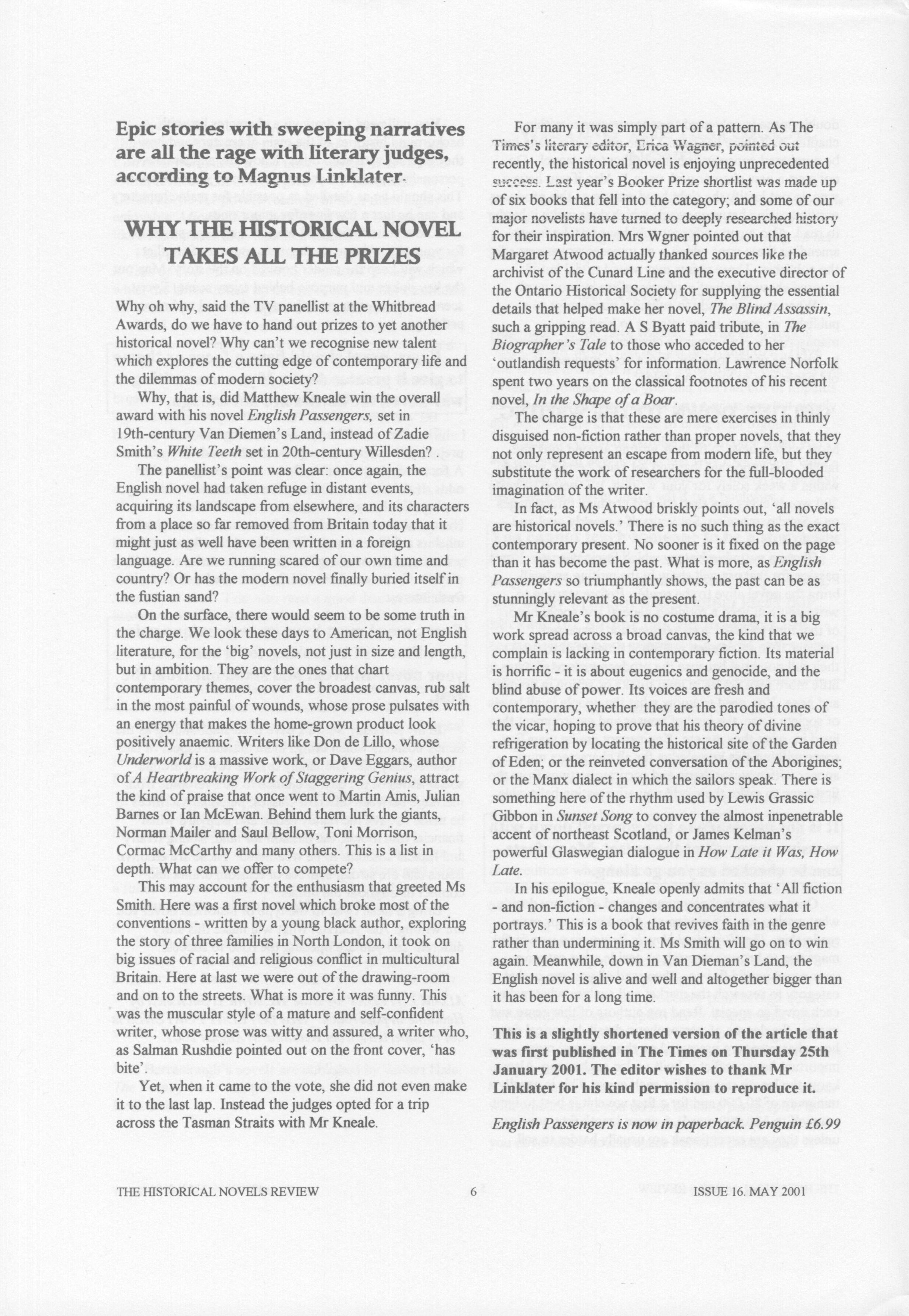This issue, a great deal packed into a small space so all I can do is encourage you to respond to the lively mix of articles and reviews. Val Whitmarsh has suggested members write in with the historical novel they have most enjoyed reading this year, especially if we've missed it! Yes, I know it's only May, but if you've recently read a new novel you wish to recommend, do tell us.