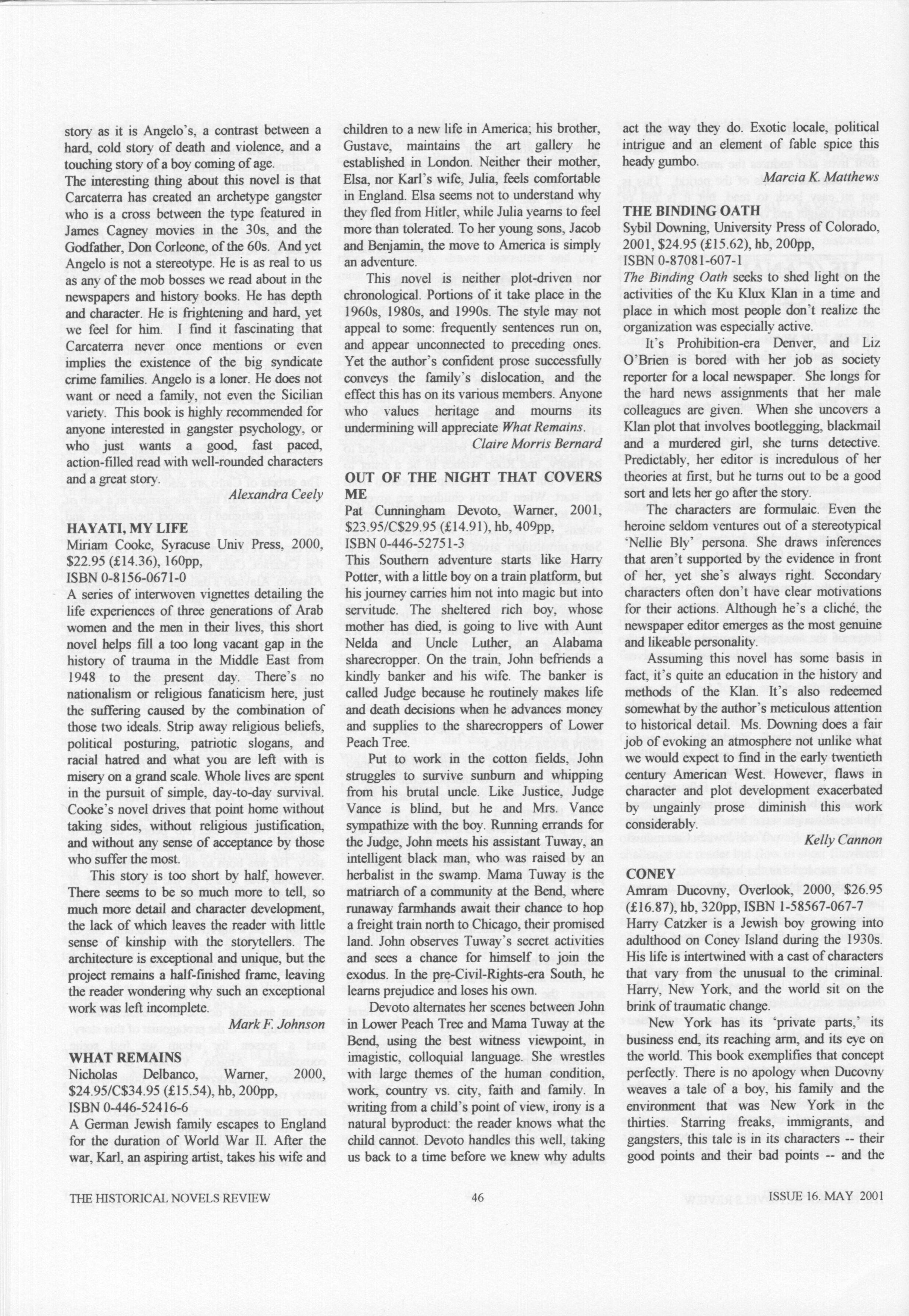 the conclusion that the typical historical novel is either a product of half-hearted research, despite an engaging storyline and likable characters, or a book-length series of facts and dates with no plot to hold the reader's interest. I find these grumblings just a bit odd, considering the positive mentions that many individual historical novels have been receiving