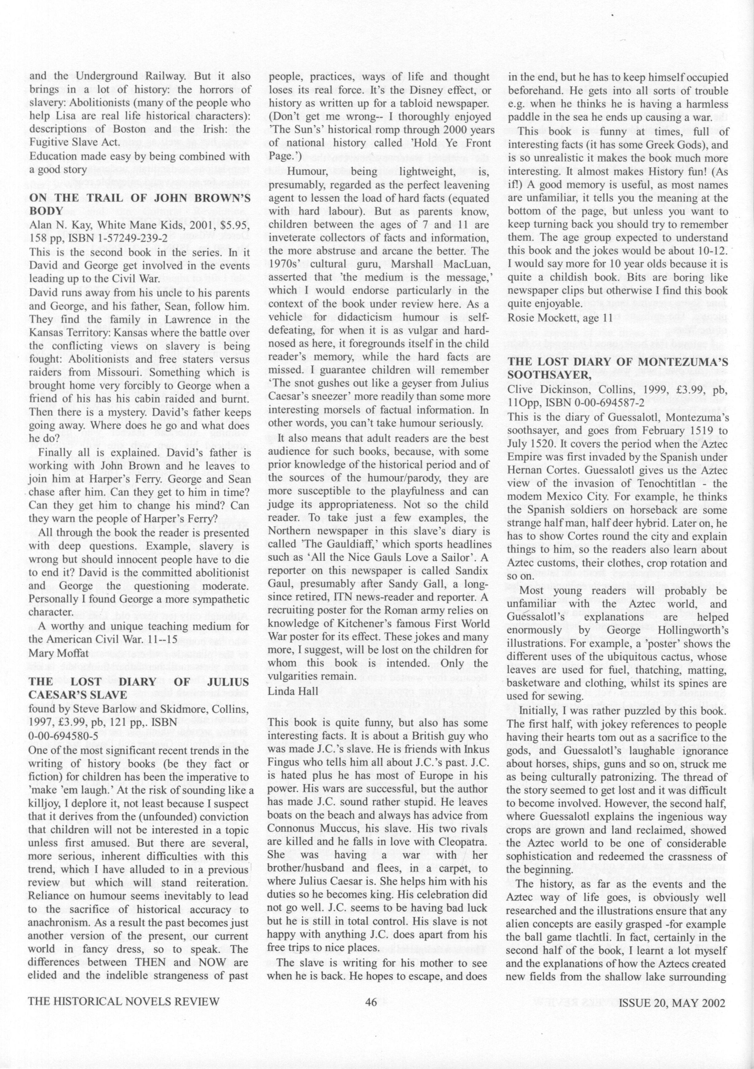 The history, as far as the events and the Aztec way of life goes, is obviously well researched and the illustrations ensure that any alien concepts are easily grasped -for example the ball game tlachtli. In fact, certainly in the second half of the book, I learnt a lot myself and the explanations of how the Aztecs created new fields from the shallow lake surrounding ISSUE 20, MAY 2002