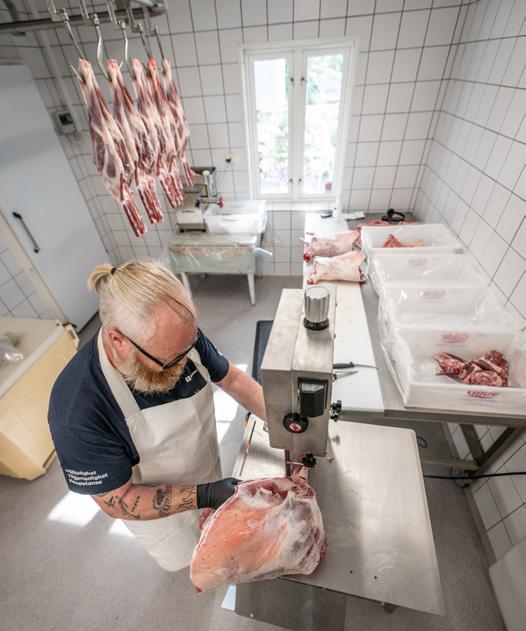 Knivene er skarpslipte, saga går jevnt, og kjøttet fordeles raskt i ulike kasser inne på Hurran gård sitt eget slakteri på Flatval.