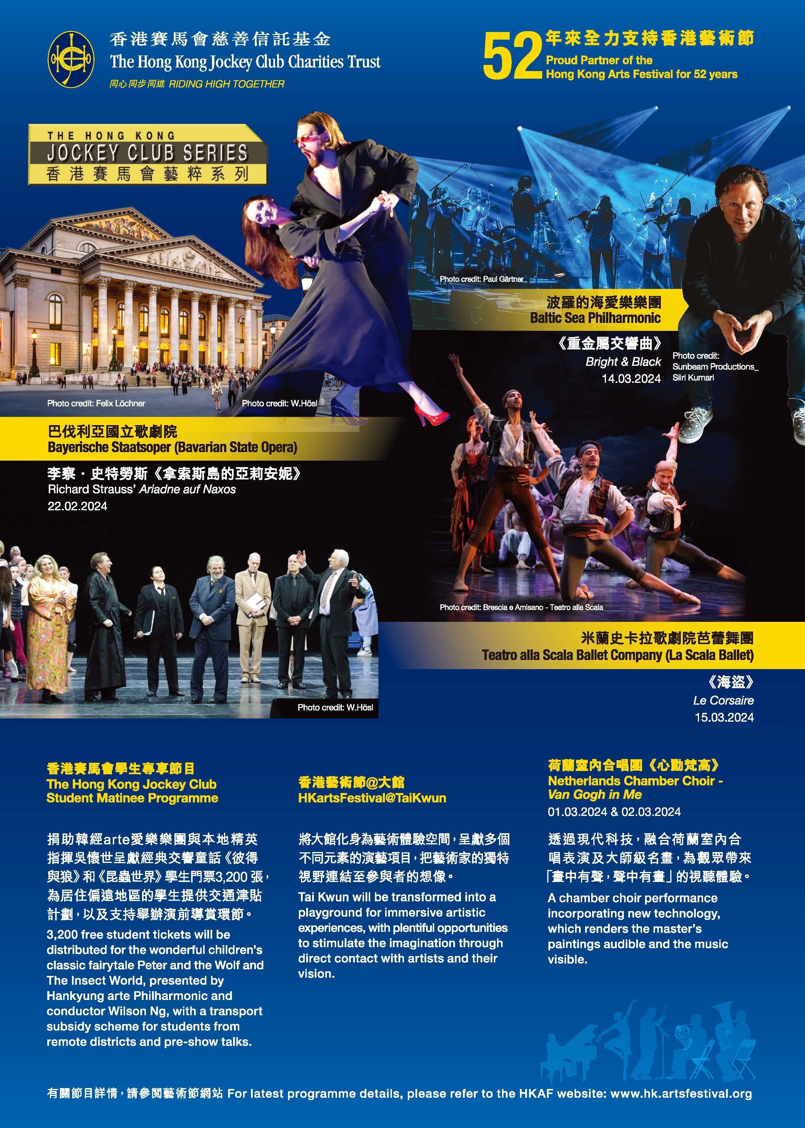 Over this past half century and more, the Hong Kong Arts Festival has grown into a celebrated international cultural event. This year promises to be another memorable Festival, featuring about 1,400 overseas and local artists in more than 150 performances across multiple genres, from music, opera and Chinese opera to theatre, dance, multi-arts and large-scale special events.