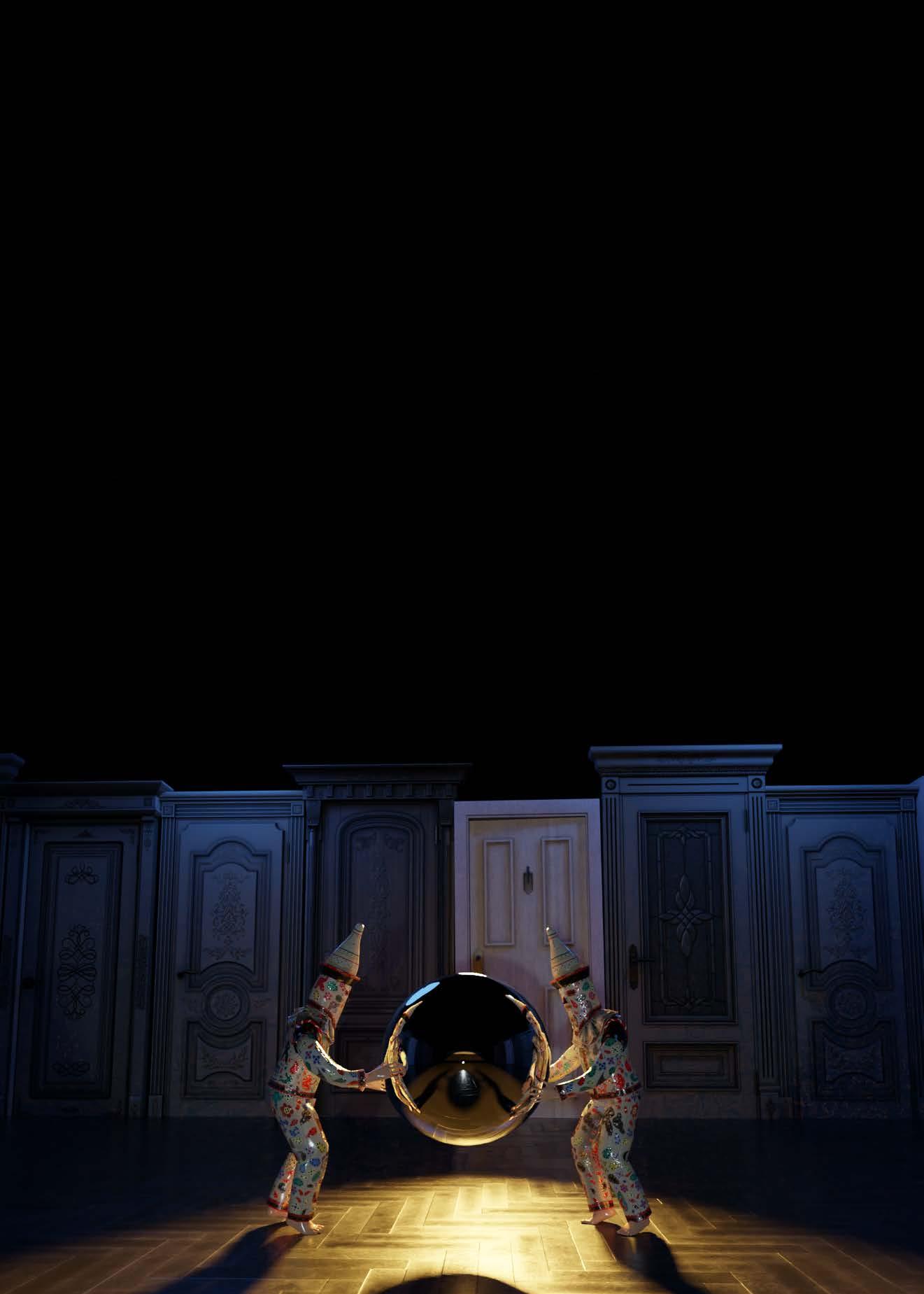 As you visualise yourself sitting in the very same place, the virtual copy of the stage distorts and takes liberties, proposing a double interpretation of the piece. A dialogue between these two visions then begins, like a diptych or a confrontation, expanding their own fields of resonance.