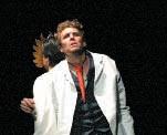 Masetto and Ottavio similarly embody the inferiority of the other men to Giovanni, differentiated in their respective relationships to woman, and set in relief as a contrast to Giovanni’s perception of women. Masetto, within a narrow bourgeois horizon, sees woman as maid and mother, while Ottavio, in the strictly formalistic framework of a chivalric ideal, commits woman to the altar of a goddess to the high tower of the inaccessible. It is only Leporello that breaks out from the symmetry of these characters. Grown far beyond the clichéd role of the servant, he clings with an almost fanatical love-hate to the heels of his master. He writes with a movingly meticulous obsession about the life story of his master, hunting tirelessly, yet always becoming tired, searching for the secret of this maniacal Leviathan. He scampers ever onwards through a labyrinth of feelings, torn hither and thither between fear and rapture, to become in the end an embodiment of the impossibility of copying, fathoming or holding down this Giovanni.
