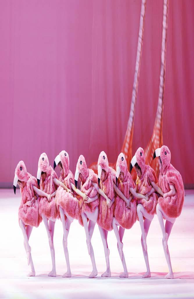 笛之舞則由一群黃冠鳳頭鸚鵡擔 綱。在搜集資料時,我被 1915 年老 虎襲人的新聞所吸引,因此,一頭 不受歡迎的貓科動物出現,探訪翩 翩起舞的鳳頭鸚鵡。為向飲食文化 致敬,傳統薑餅媽媽變成了點心媽 媽和點心小丑。表演中更有土生土 長的中華白海豚和來自山頂的一 頭膽小野豬短暫亮相。之後的第二 幕在洋紫荊花海下開展,洋紫荊 花進佔舞台,最終跳起了華爾茲。
