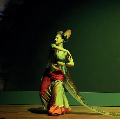 本會榮幸地受邀於現場選播大型舞蹈詩《緣起敦煌》選段視 頻,接著便是由陳磊老師特為此次活動創作的全新獨舞《聞法 飛天》,並由本地藝人蔡頌思小姐作首次公演。整隻舞蹈背景 以洞窟動畫襯托,運用打印了梵文的5米長薄紗作為佛法經卷 道具,以操控薄紗的不同互動方式來呈現讀、看、醉、融等動 態,將敦煌壁畫中的靜態舞姿融入當代肢體動態之中,以多元 “聞法”的動態形式詮釋敦煌經典飛天“悟道”的美態。