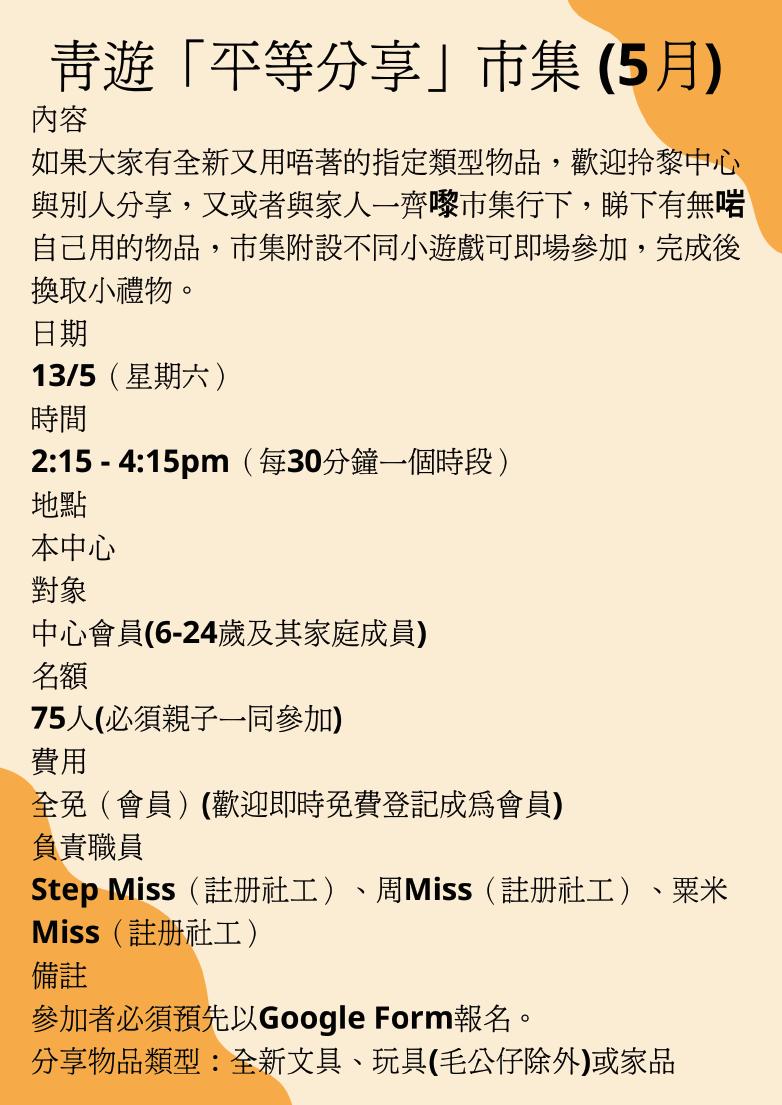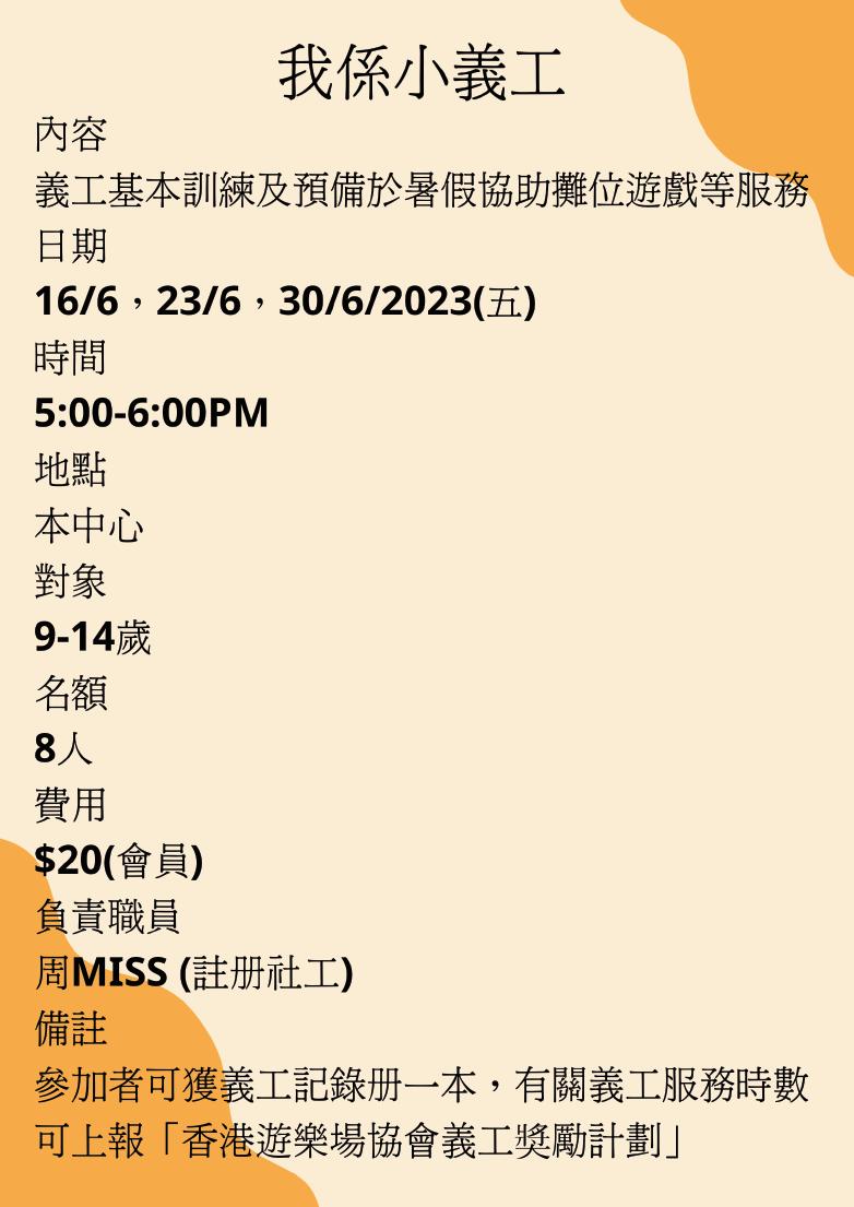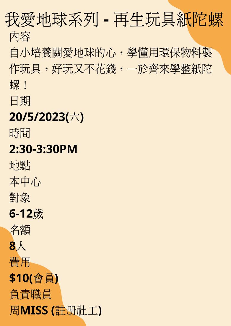 會員意見反饋: FB: IG: 中心通訊 2023年4-6月 報名日期: 3月23日(四) 2:00p.m. 聯絡我們 地點:新界青衣長發邨長發社區中心 二至四樓 電話:2433-5277 電郵:tyit@hkpa.hk FB:香港遊樂場協會賽馬會青衣 青少年綜合服務中心 製作日期:2023年3月 督印人:萬漢威