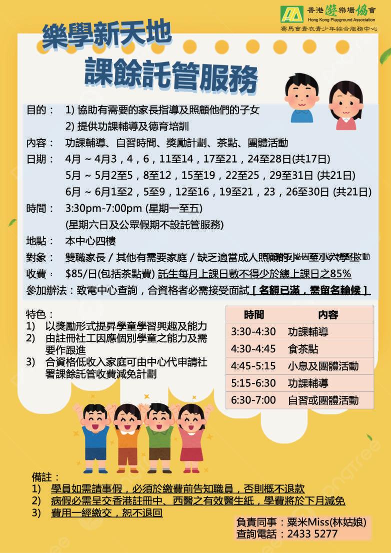 (2) 覆核功課; (3) 默書前温習 編號 N01 全科功課輔導班 班別名稱 逄星期一至五 日期 4:30-6:30pm 時間 小一至小六 10人 $65/堂 地點:中心四樓 負責同事:江sir