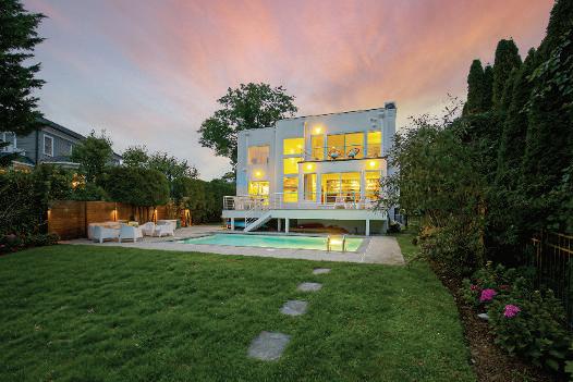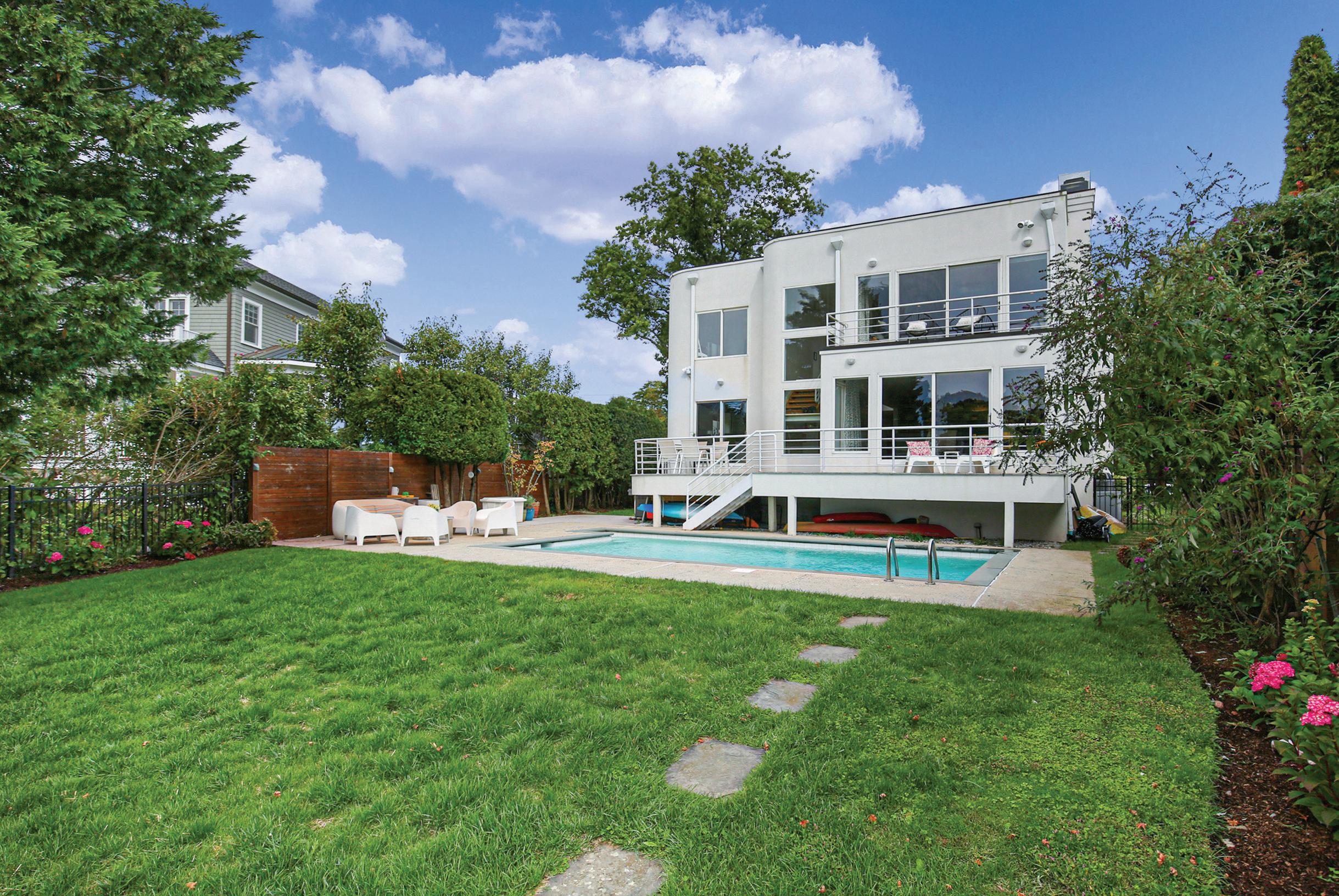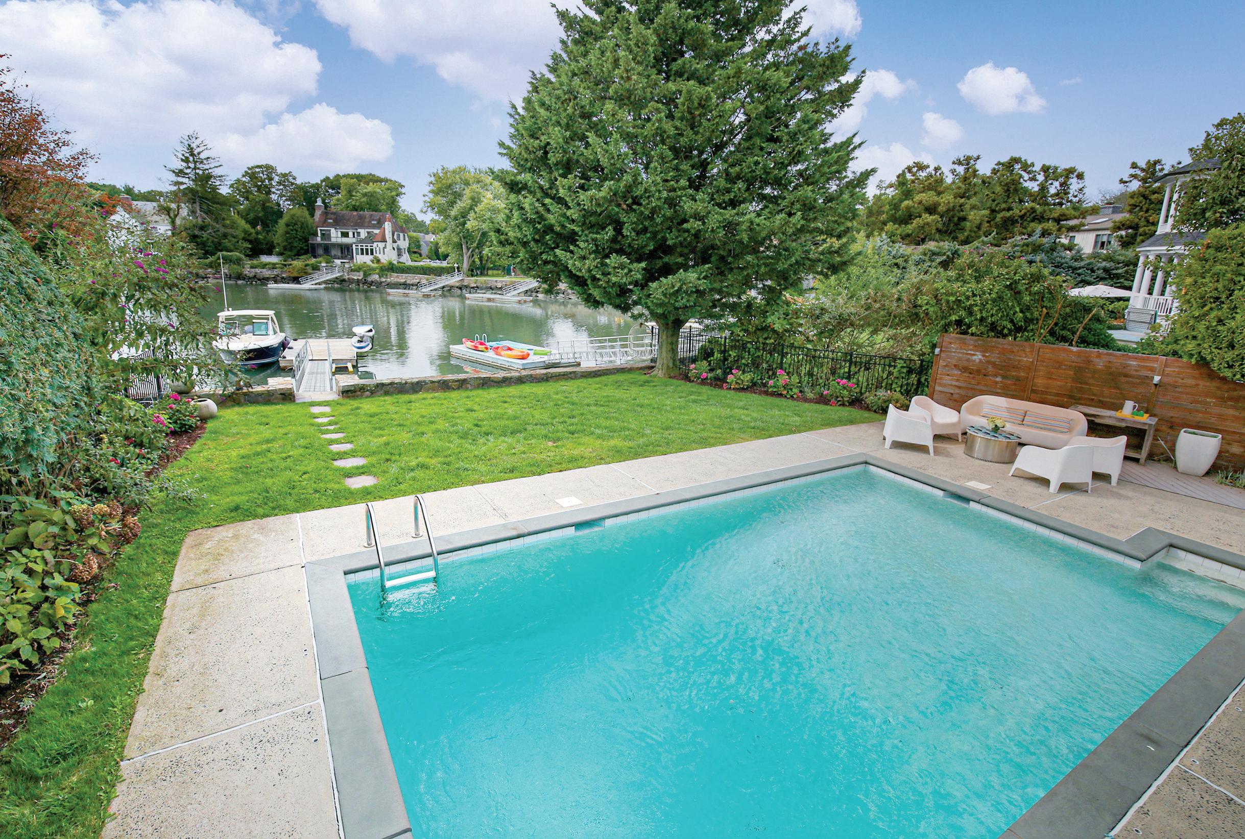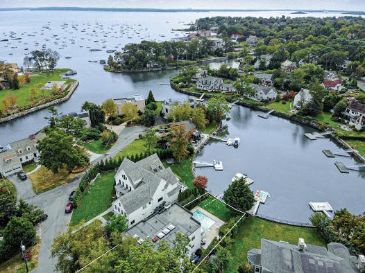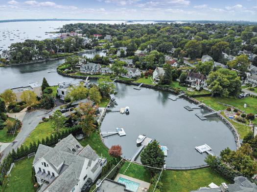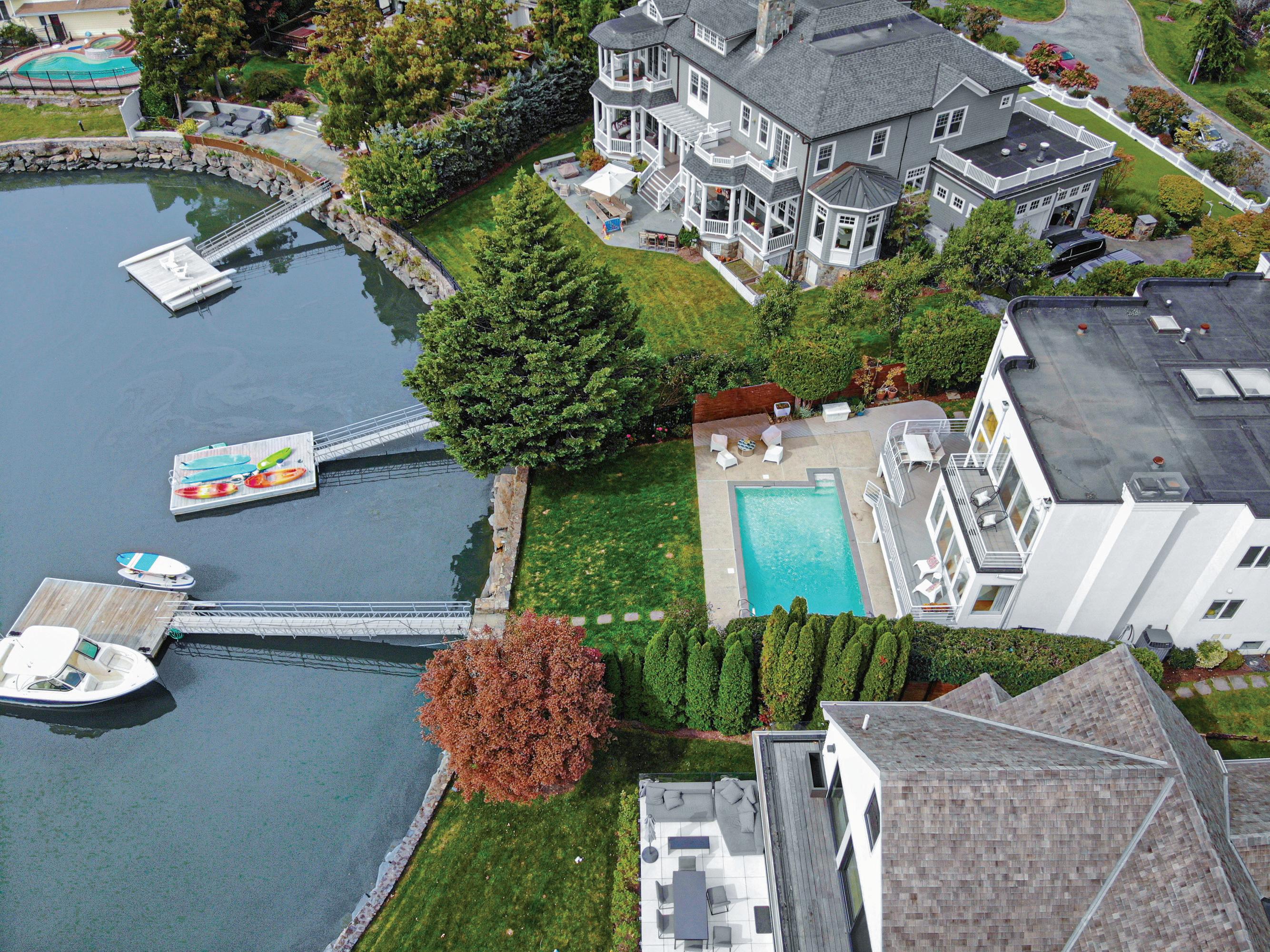 w it h w ood-burning fireplace and an eleg ant dining room overlook t he side yard. The adjoining eat -in k itchen feat ures a g enerous prep island and casual dining area, opening to a full-w id t h deck w it h elevated w aterfront view s. A spacious fam ily room w it h fireplace and sliding g lass doors extends to t he rear deck , overlook ing t he heated in-g round pool and t ranquil w ater beyond A g uest suite w it h full bat h, pow der room , and access to t he att ached t w o-car g arag e com plete t his level. Upst airs, t he prim ary suite is a t rue ret reat , capt uring breat ht ak ing w ater view s and offering private terrace access w it h a sitt ing area w it h fireplace, t hree w alk-in closet s, and a spa-like bat h. Three addit ional bedroom s? one en-suite? plus a hall bat h and second-floor laundry are arrang ed around a brig ht , open landing . The low er level provides approxim ately 1,268 square feet of flexible bonus space. This coast al hom e offers a rare blend of ult im ate convenience, and dist inct ive m odern w aterfront living in Larchm ont Manor.