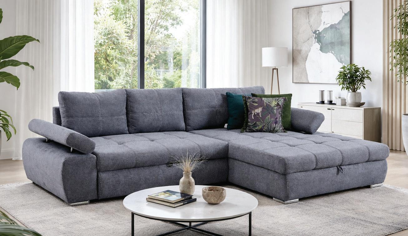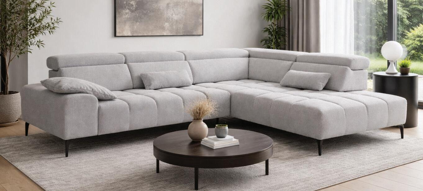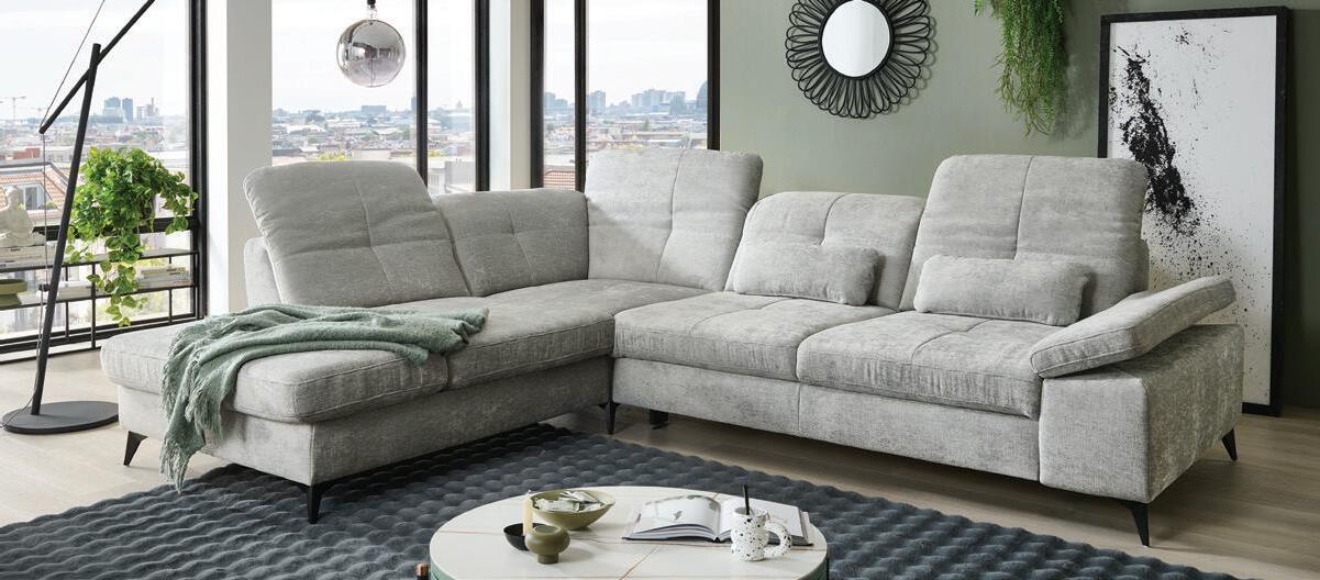 Kotna sedežna garnitura BREVA, vzmeteno, 294x174cm, leva ali desna postavitev, ležišče, predal, 2x nastavljiv rokonaslon, material ASTON 13 siva