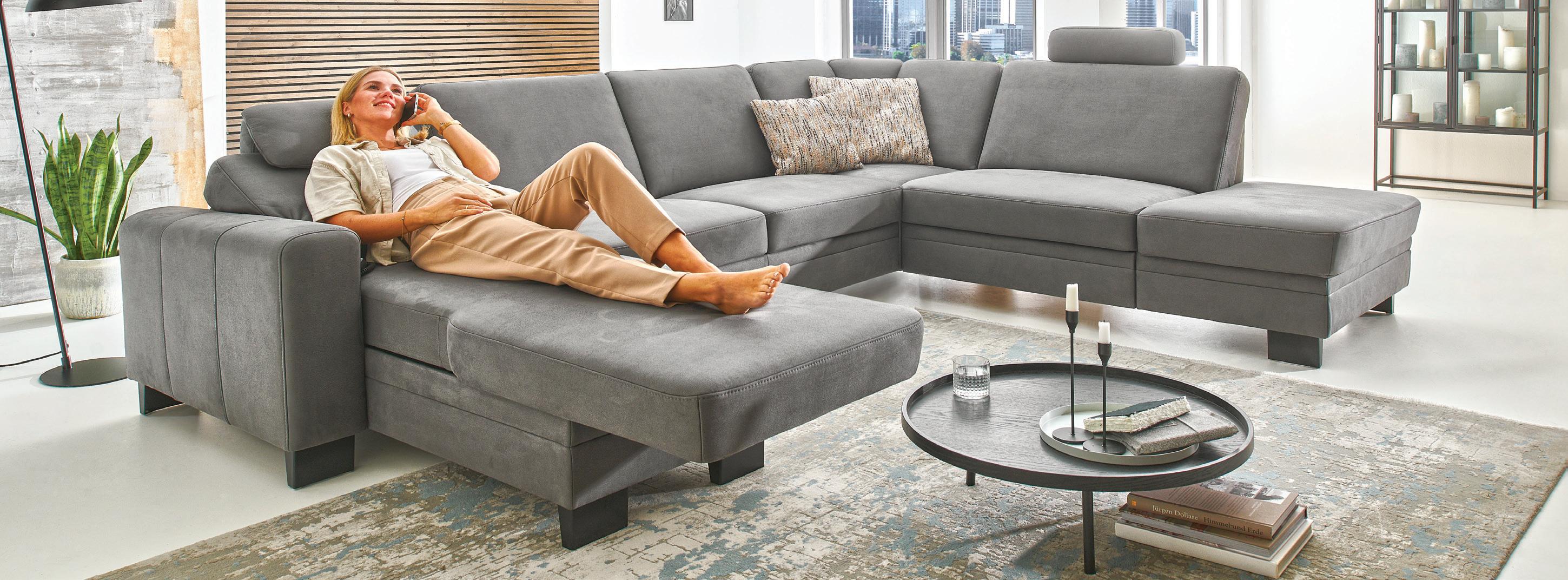 €2.622 Kotna sedežna garnitura DONATELLO, vzmeteno, 300x218cm, leva ali desna postavitev, ležišče, predal, 3x nastavljiv vzglavnik, nastavljiv rokonaslon, blago TEXAS 90 sv. siva, 92 siva ali 95 taupe, kontrastni šivi