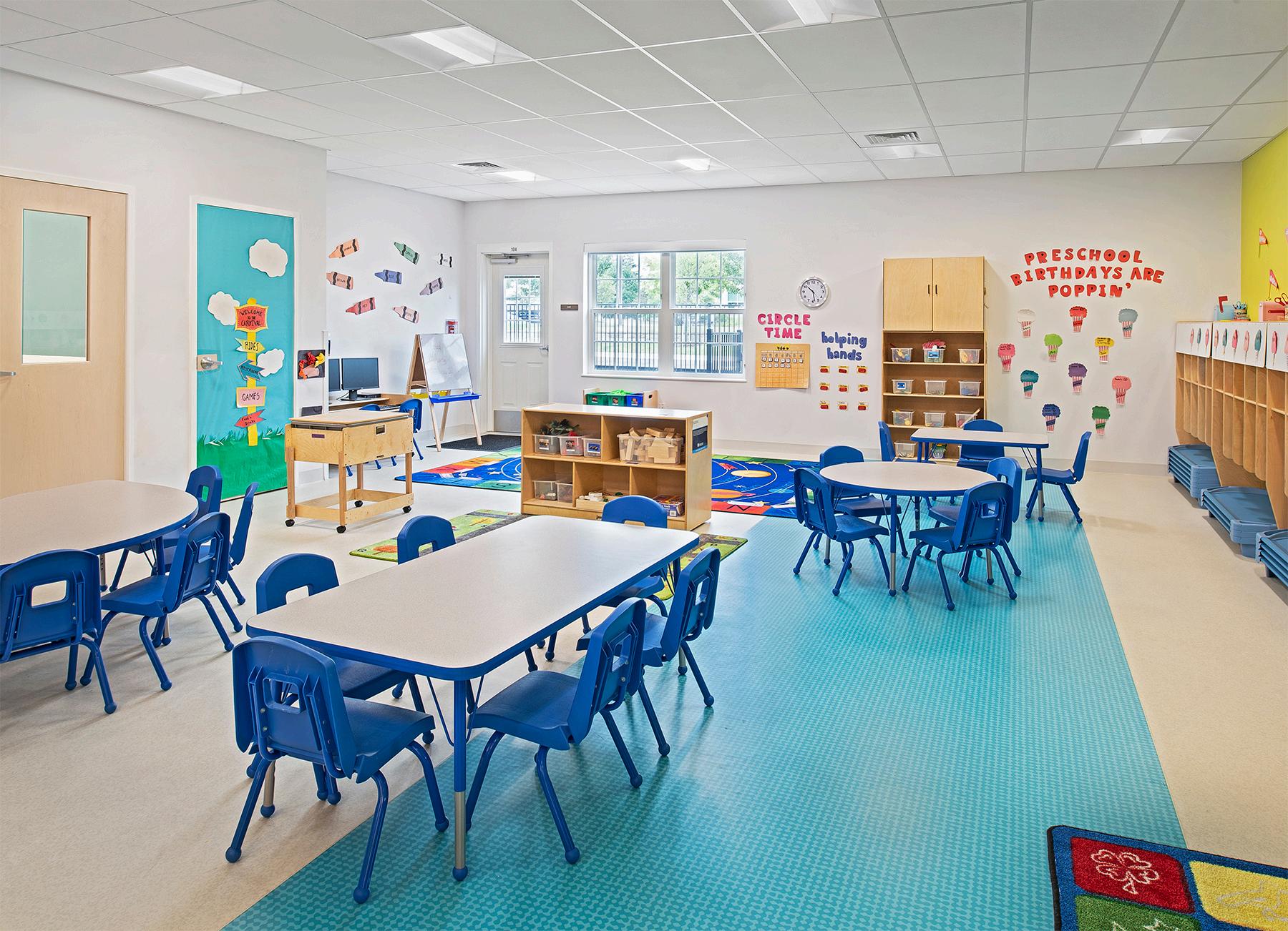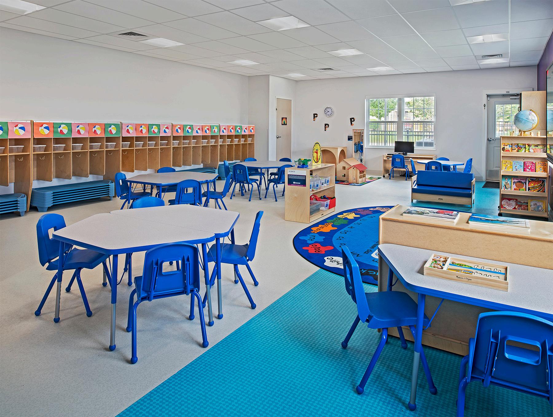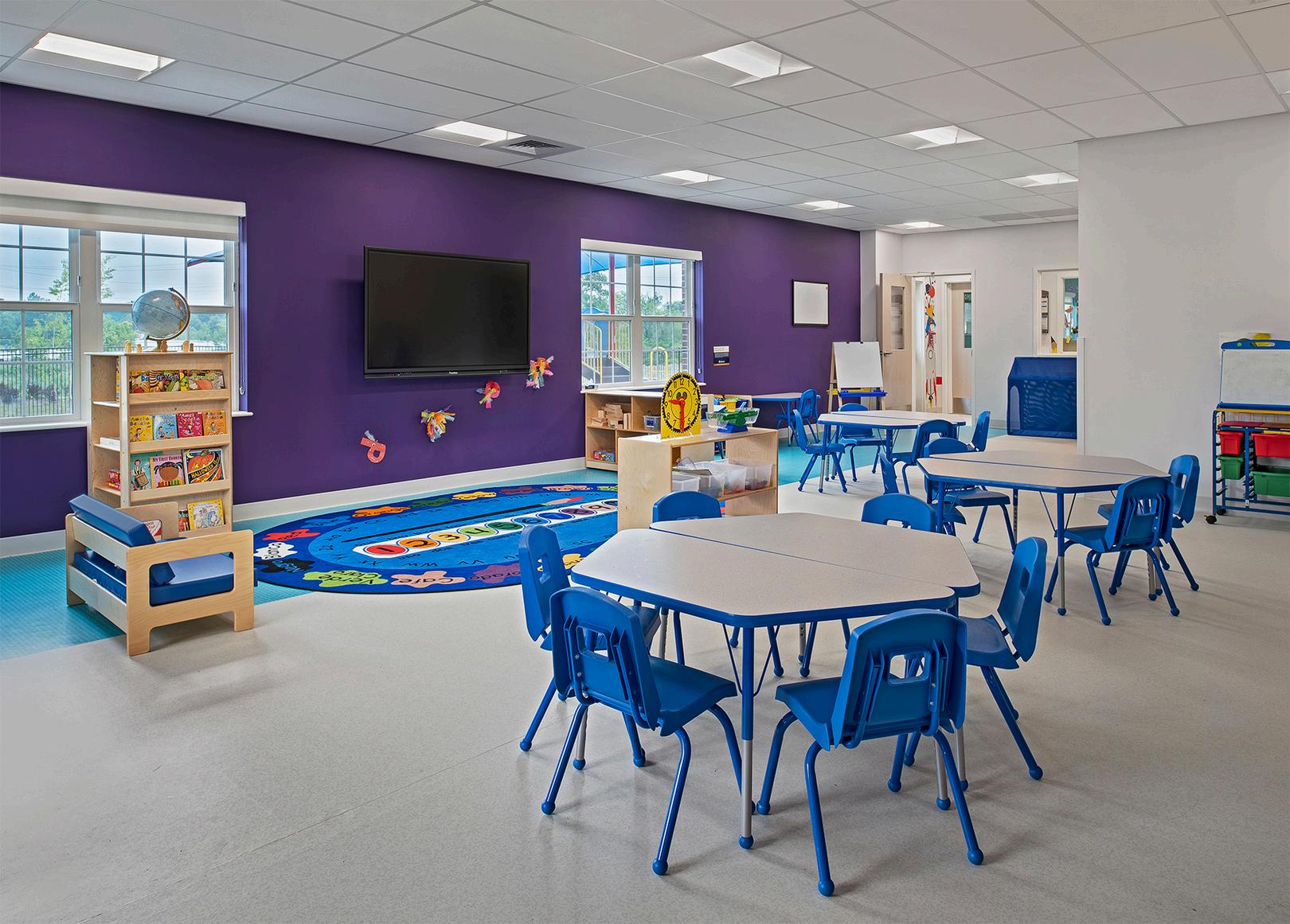 TheGoddardSchool’scorporatefocusis inthebeliefthatchildrenlearnbestwh arehavingfun.Theircommitmentisto schoolswithstrongleadership,dedicate teachers,andsupportiveenvironments allowforindividualizeddevelopmentan inspirealifelongloveoflearning By maintaininghighstandards,thewelcom schoolhouseexteriorfitsseamlesslyinto community,withbrickandstonemater creatingatimelessbuildingthatwillse schoolforyearstocome.Inside,brighta floorpatternsguidechildrenthroughth hallways,whilesimple,boldcolorblocki theclassroomscreatesenergeticspace fostercreativityandlearning
