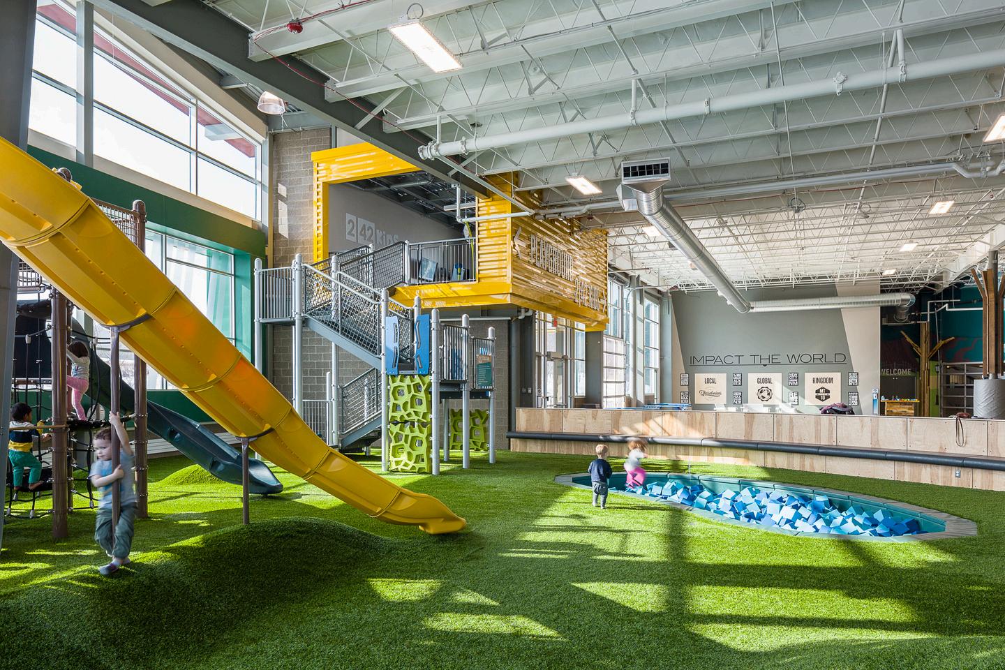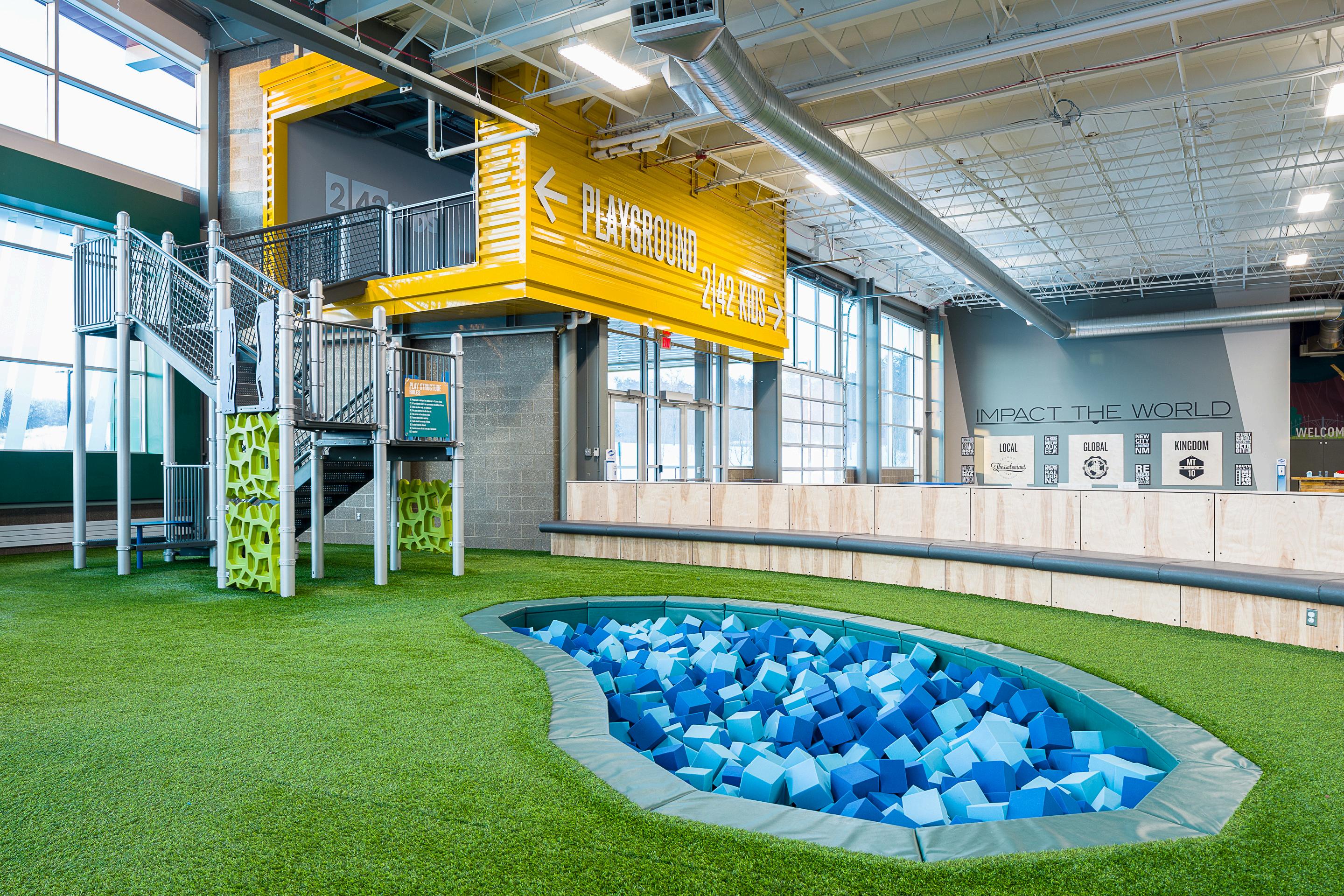 The new facility mirrors the Brighton campus in both function and character, offering meeting rooms, indoor play fields, a café, and dedicated auditoriums that are open to the public throughout the week. A shared design aesthetic featuring raw steel, barn wood, shipping containers, and distinct volumes helps define individual programs while creating a cohesive sense of place. Phasing was essential to meet rapid growth needs, with the main auditorium and offices completed first, followed by children’s and youth spaces, and later the café and sports fields