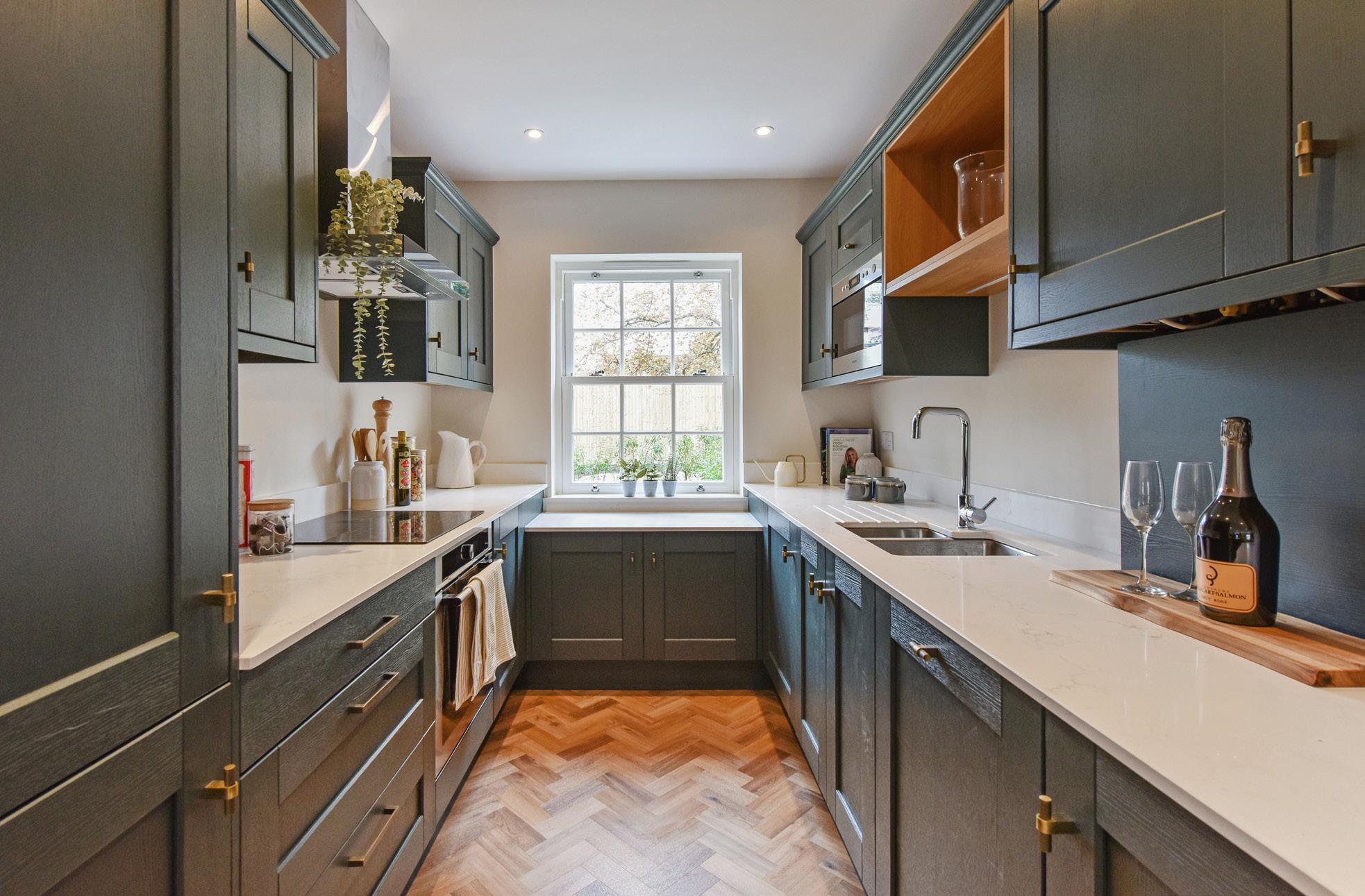 Bespoke elegant kitchen base units/walls units with shaker style doors and oak effect interior finish