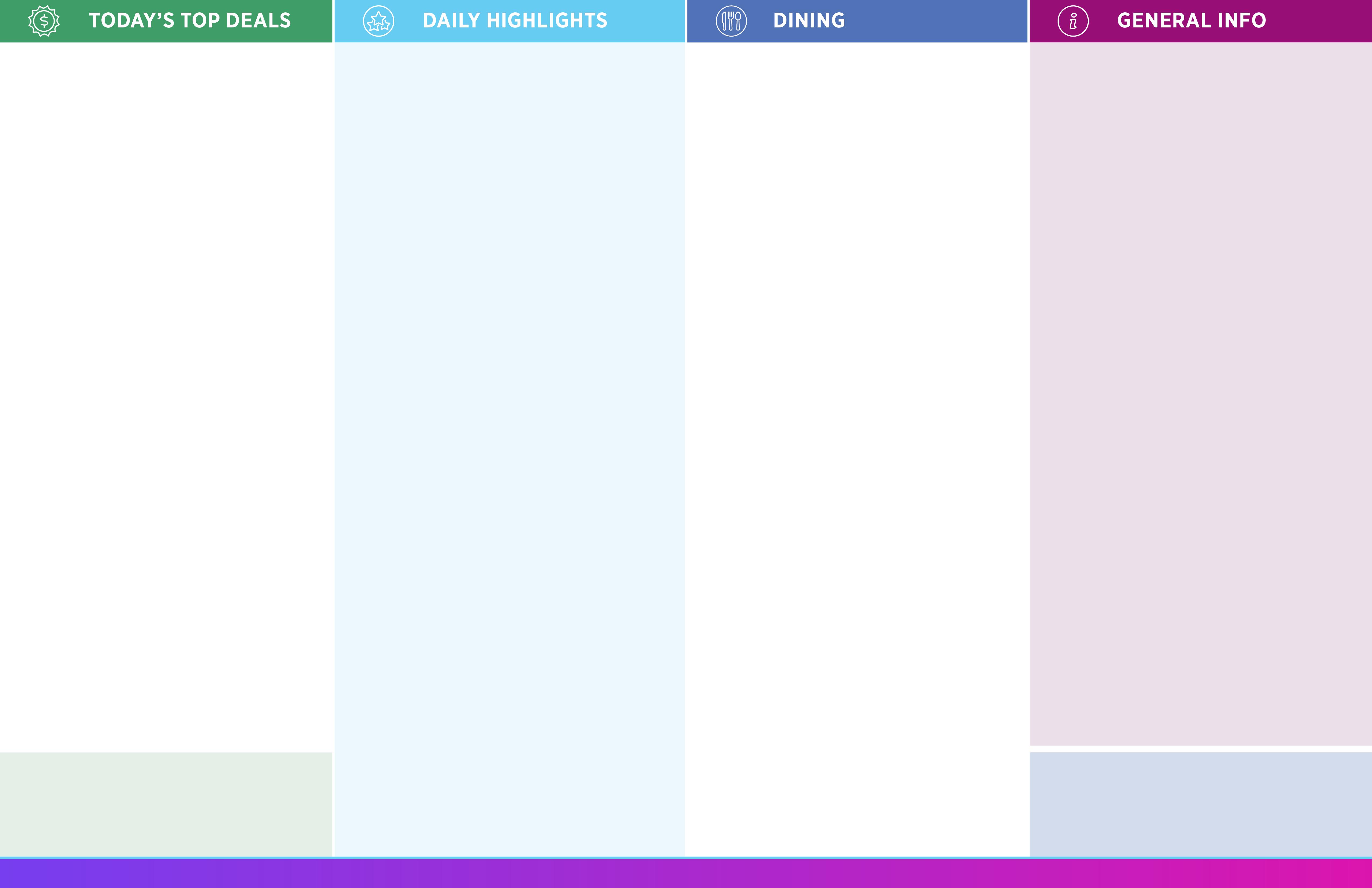 HUNGRY NOW DECK TIME •Pearl Café 6 24 hours •Sorrento’s Pizza 5 11:30 am - 2:00 am COMPLIMENTARY DINING • AquaDome Market 15 10:30 am - midnight • Basecamp 16 2:00 pm - 8:00 pm • Dining Room 3 7:00 am - 8:30 am 3, 4, 5 5:00 pm 5 6:45 pm 4 8:00 pm 5 8:30 pm • El Loco Fresh 15 2:00 pm - 8:00 pm • My Time Dining 3 6:30 pm - 9:00 pm • Surfside Eatery 7 7:00 am - 10:30 am 4:00 pm - 8:00 pm • Windjammer Marketplace 15 6:30 am - 10:30 am 11:30 am - 3:00 pm 5:30 pm - 9:00 pm