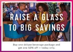 Purchase a Deluxe Beverage Package today and get one half off! Enjoy a selection of beers, wines, spirits plus non-alcoholic beverages for the duration of your cruise.
