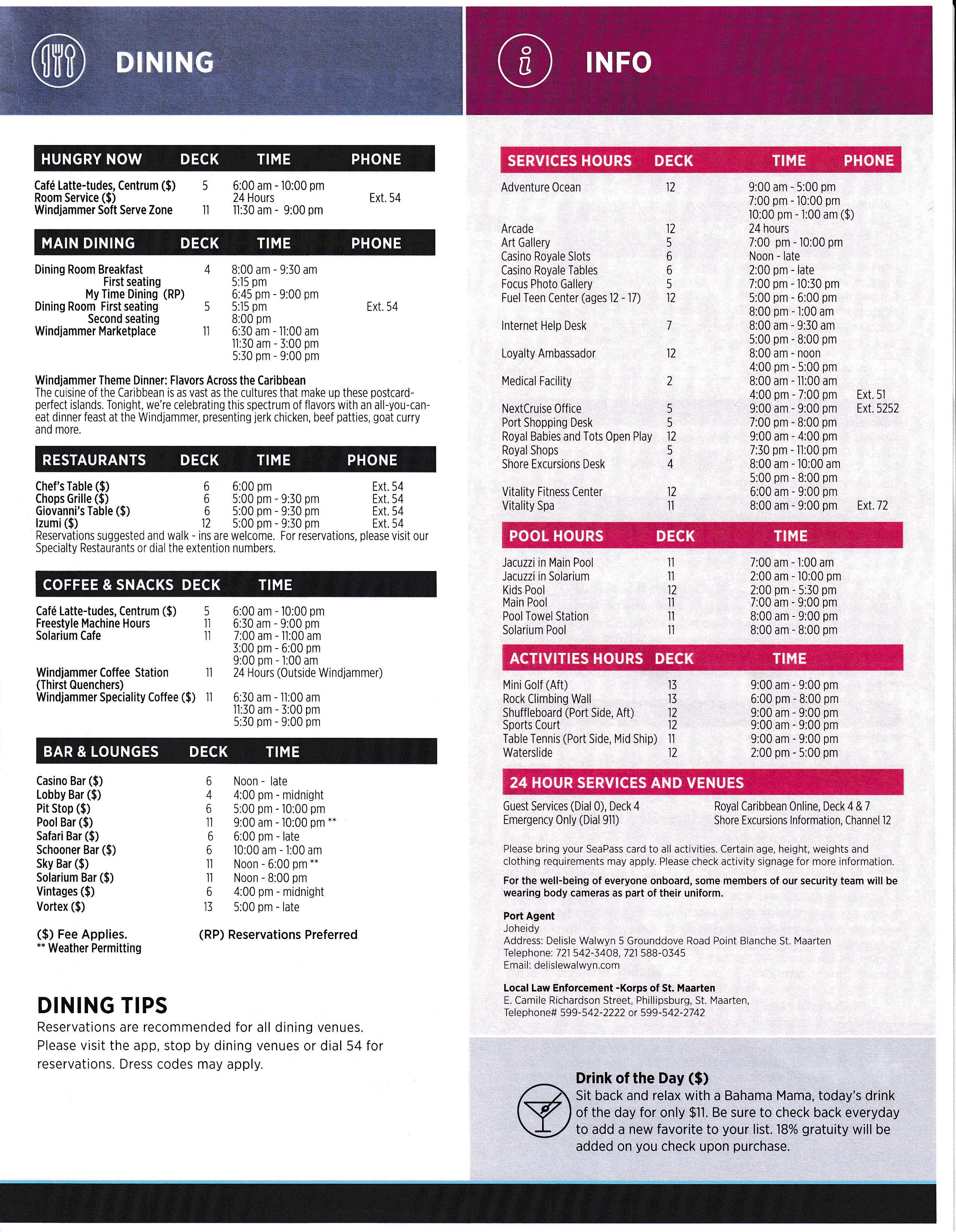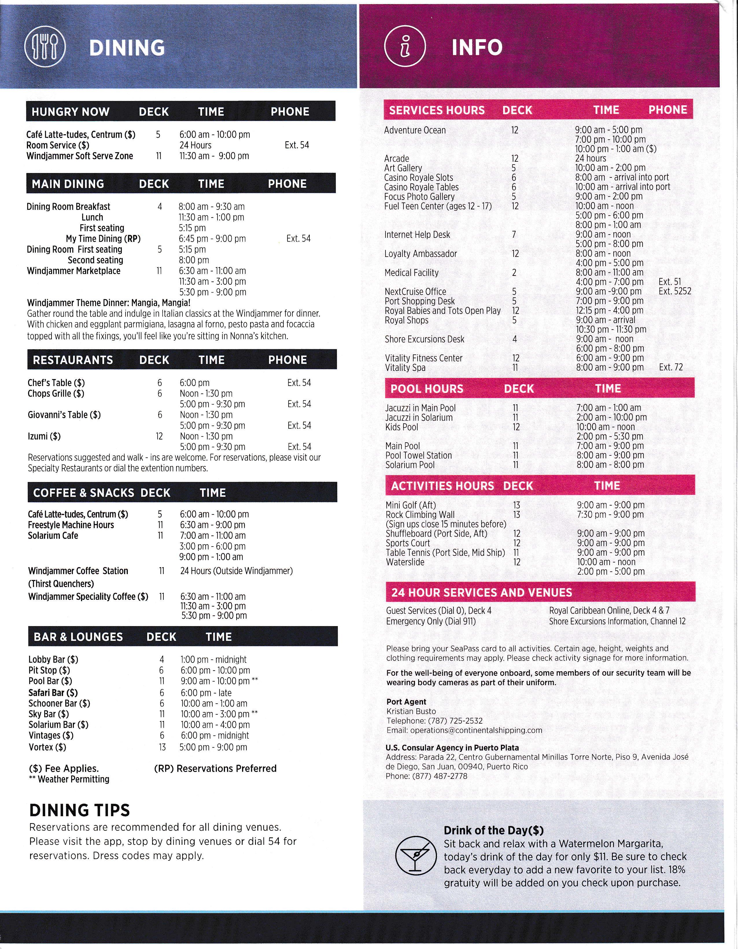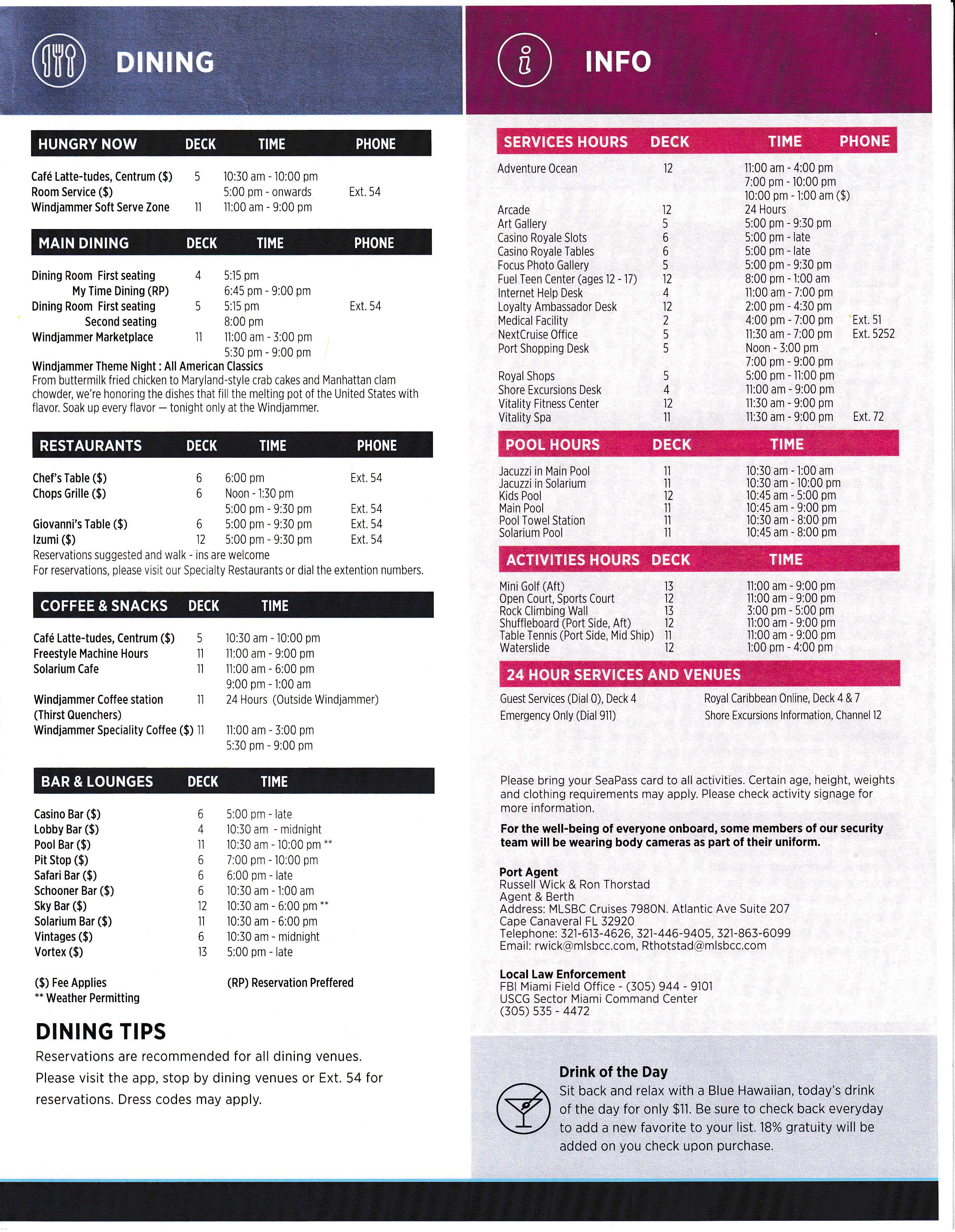 SERVICES HOURS DECK TIME PHONE POOL HOURS DECK TIME ACTIVITIES HOURS DECK TIME 24 HOUR SERVICES AND VENUES Drink of the Day($)