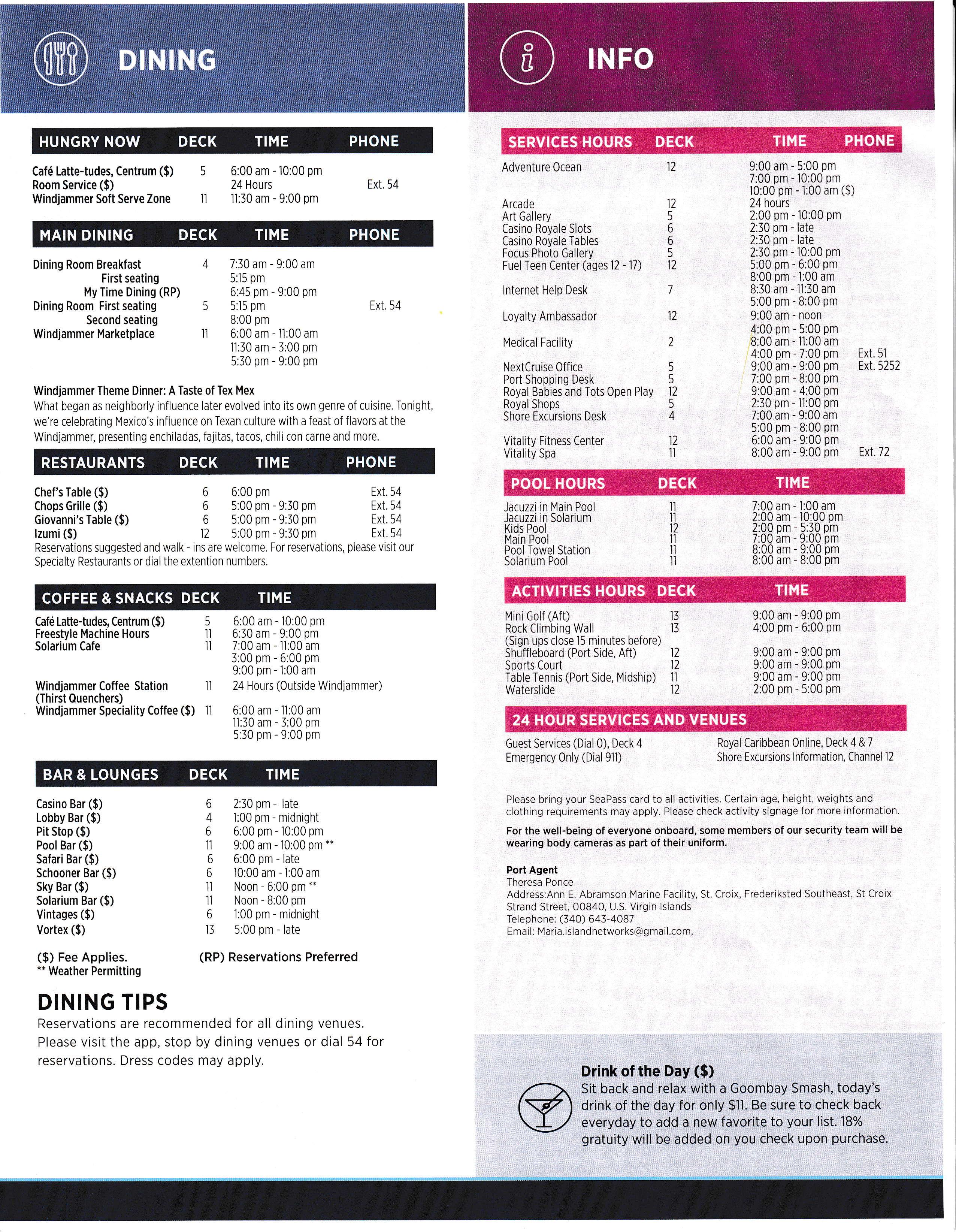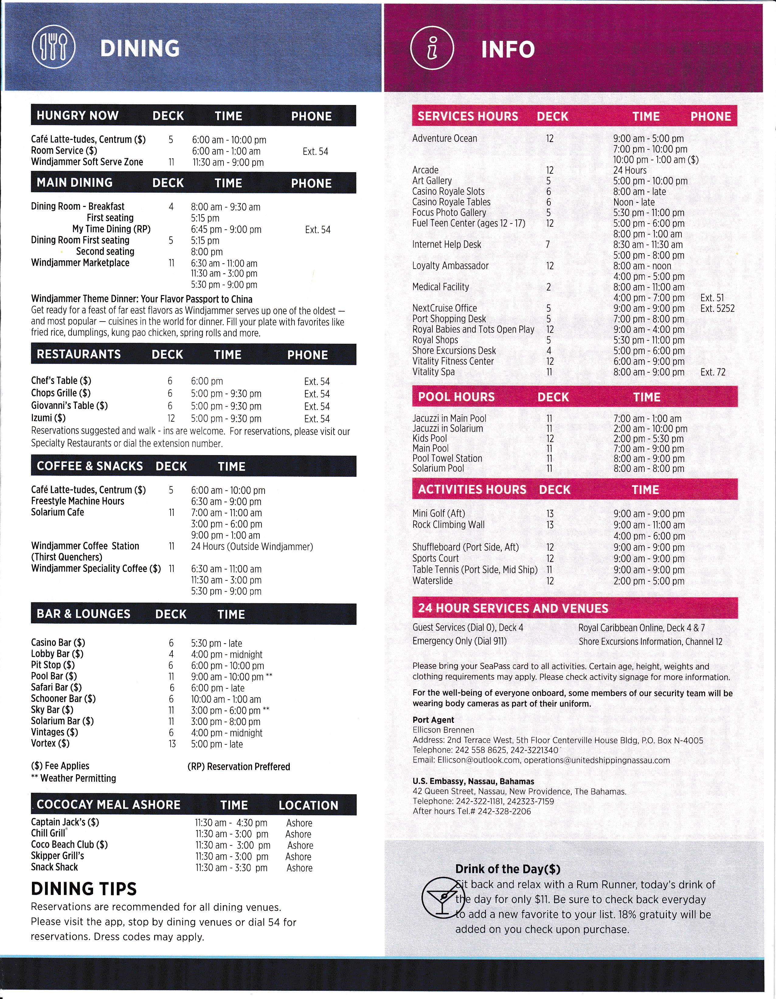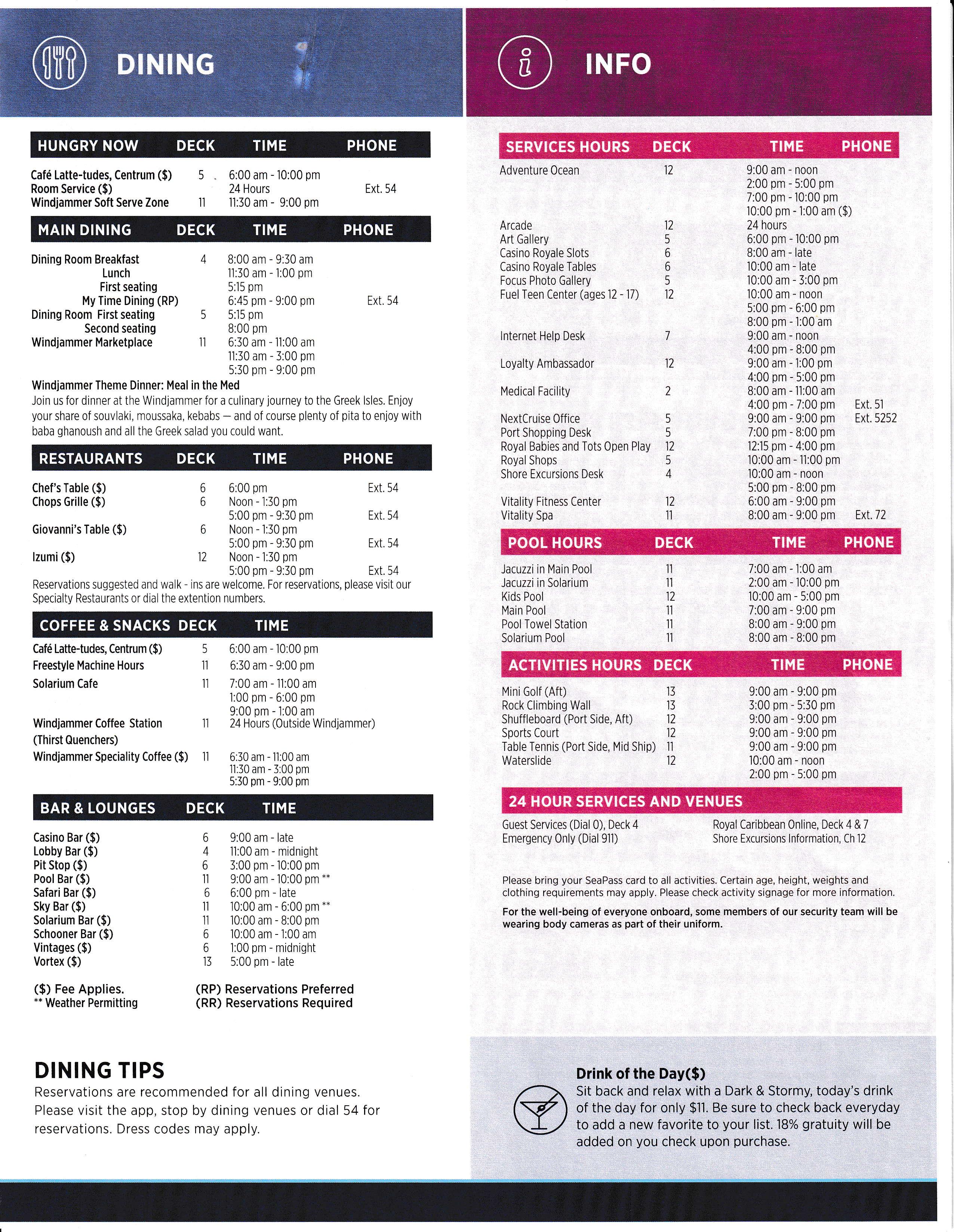 SERVICES HOURS DECK TIME PHONE POOL HOURS DECK TIME ACTIVITIES HOURS DECK TIME 24 HOUR SERVICES AND VENUES Drink of the Day($)