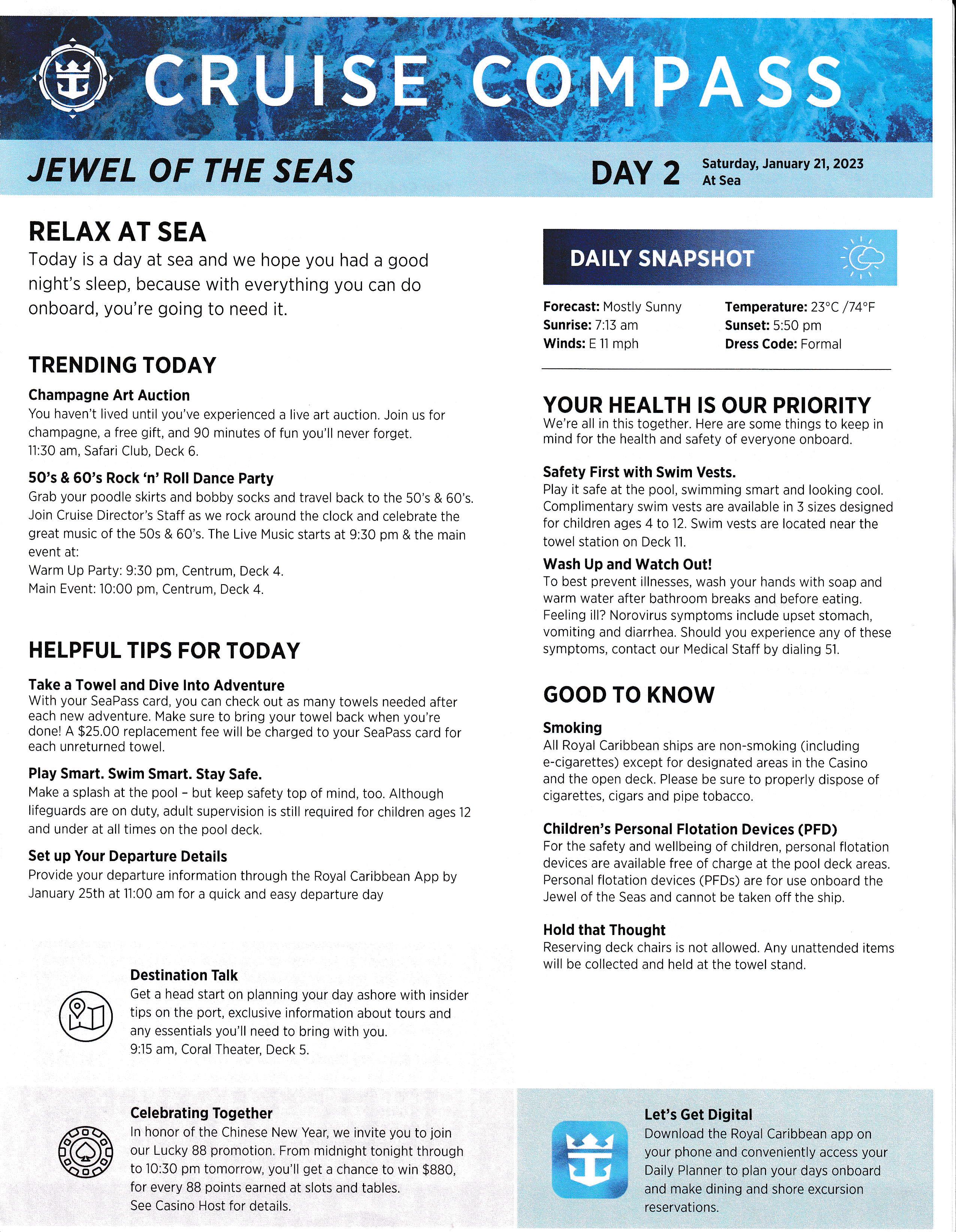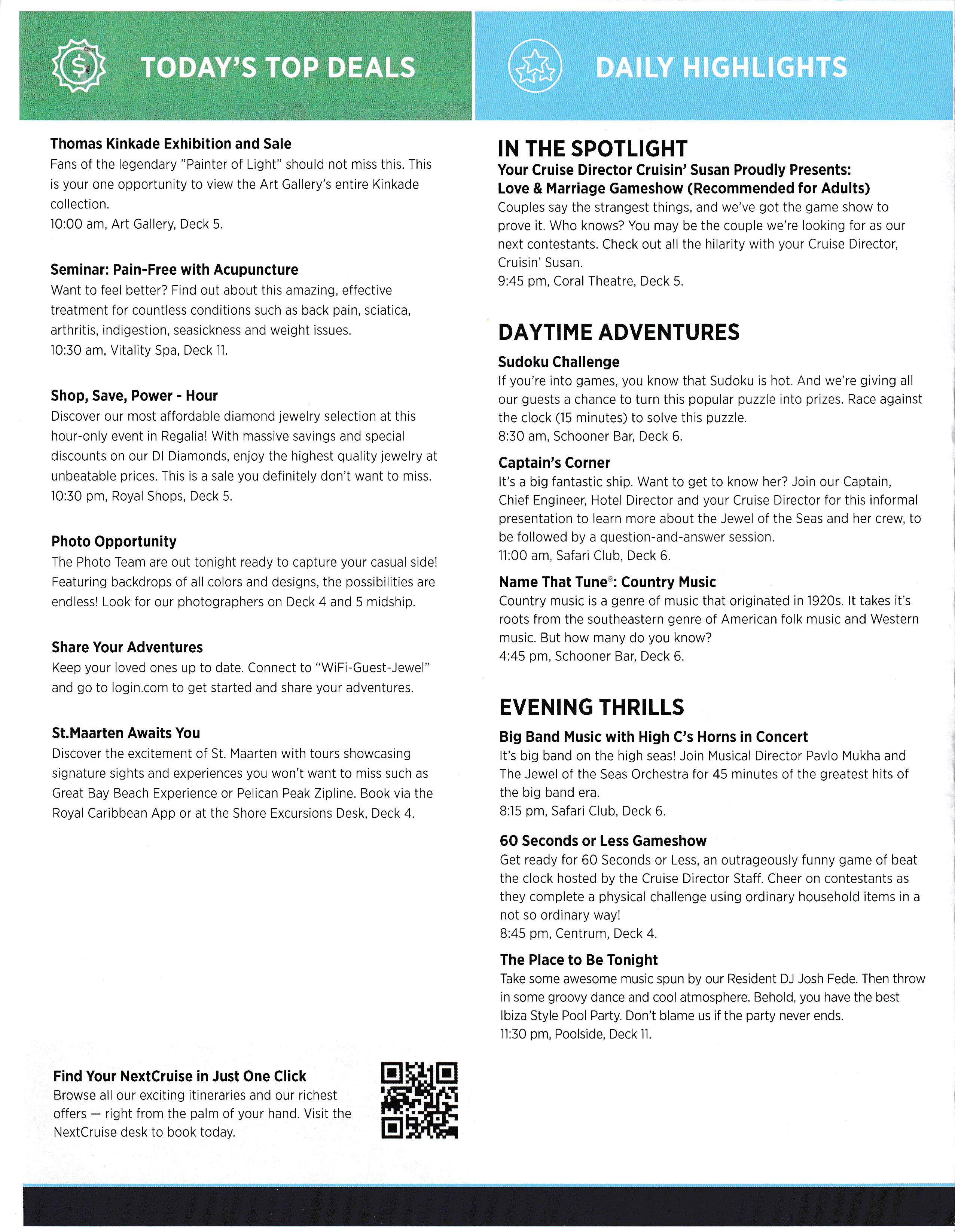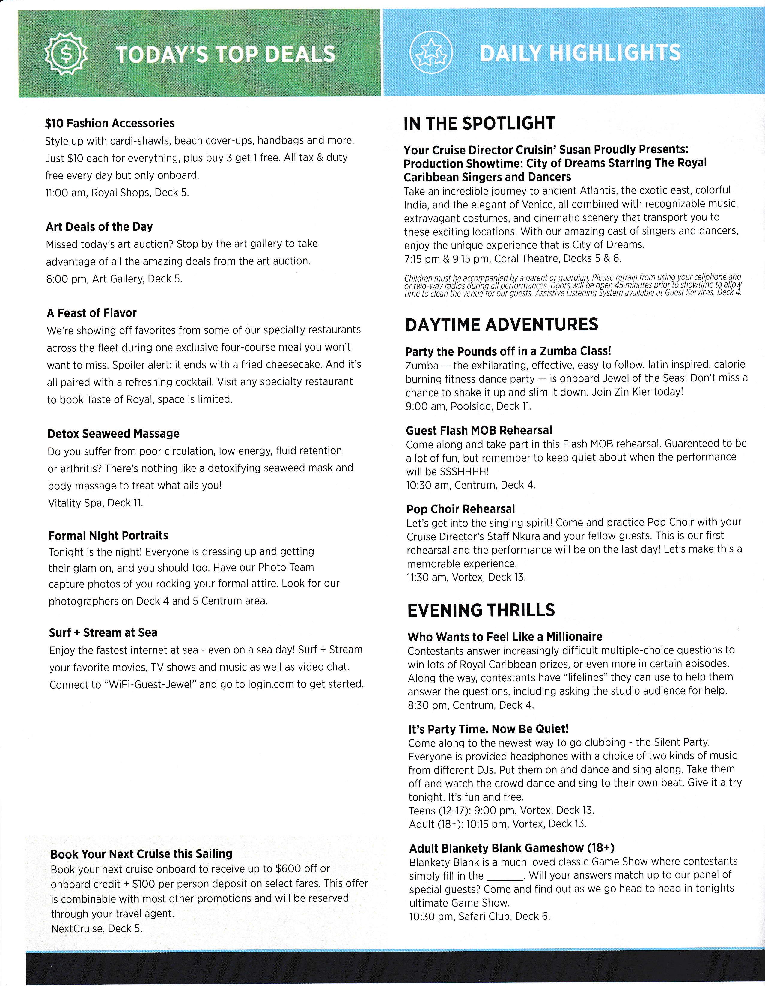 Welcome to Jewel of the Seas! Everyone deserves a vacation. You'll find endless opportunities to make the most of every moment - like game-changing activities, world-class dining, show-stopping entertainment, and plenty of ways to unwind.