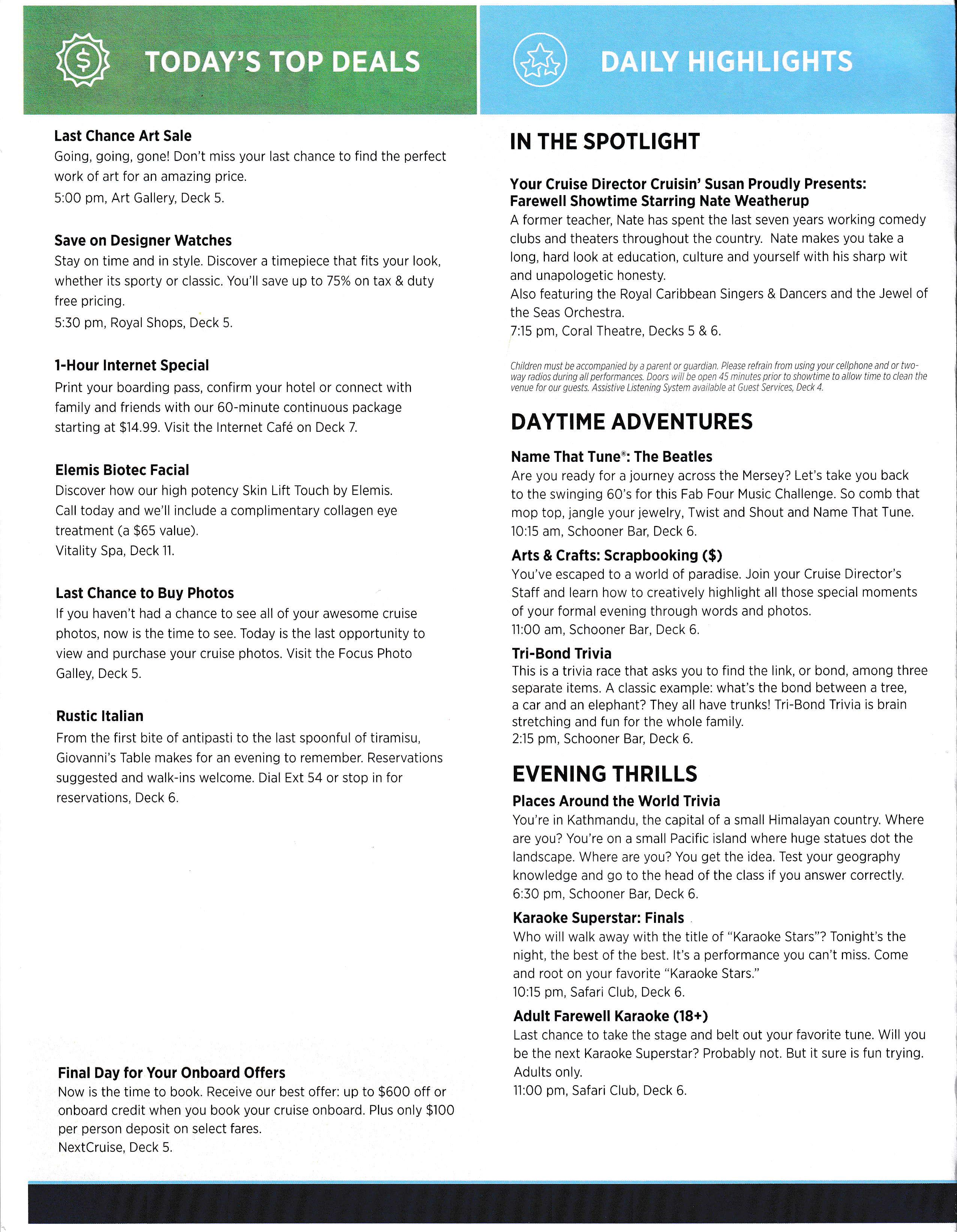 Please bring your SeaPass card to all activities. Certain age, height, weights and cloth ng requirements may apply. Please check activity signage for more information.