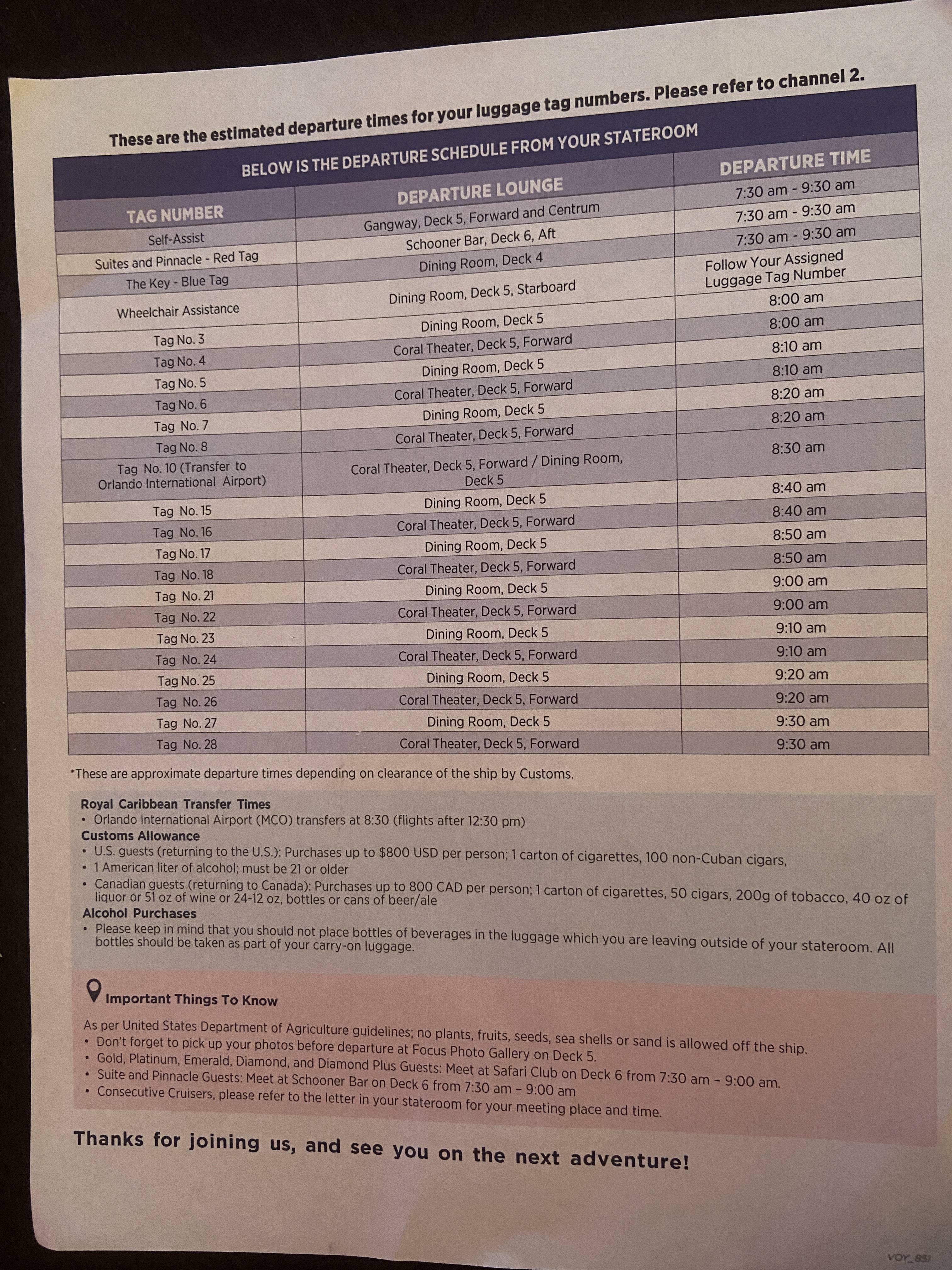 Due to the high volume of luggage, we will happily deliver luggage until 6:00 pm tonight. lf you accidentally packed any prohibited items please proceed to Guest Services after 7:00 pm to collect your Iuggage.