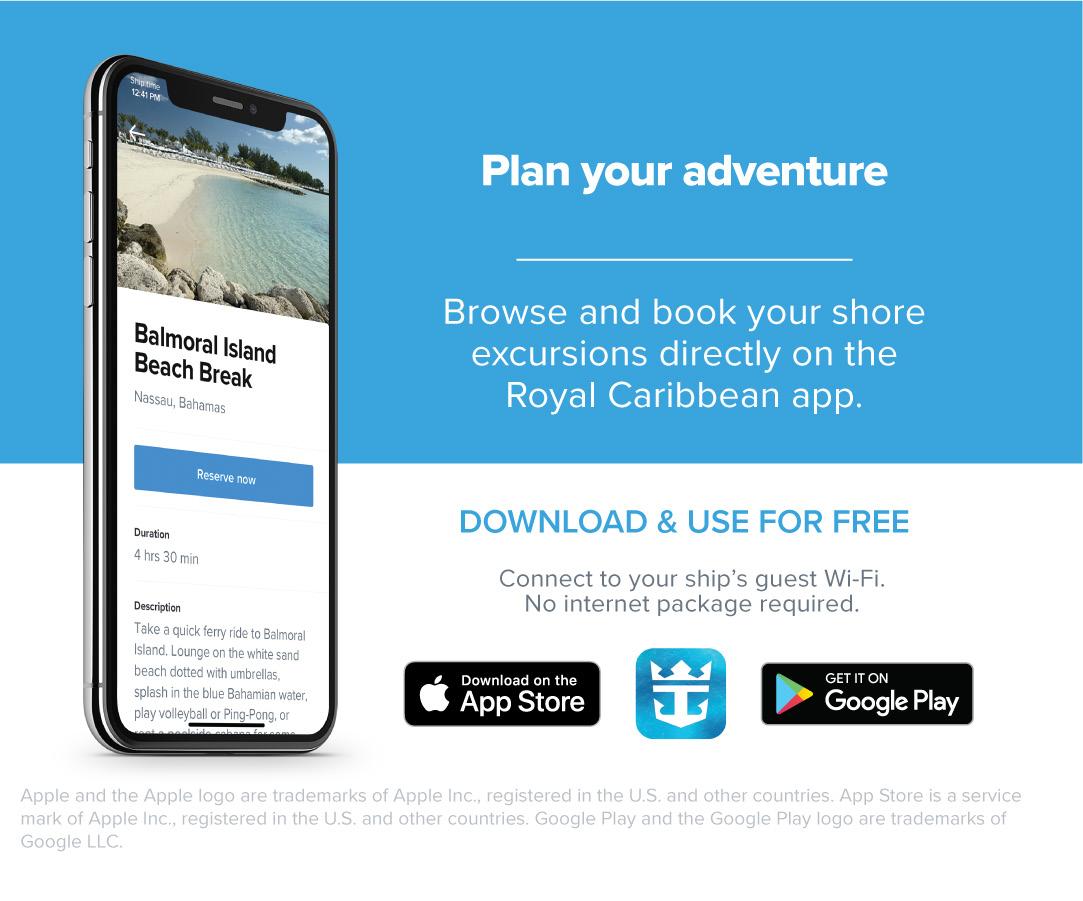 Want to book a shore excursion right now? You can research, reserve a tour, and receive instant confirmation right on your phone. Book today using the app or by visiting the Shore Excursions Desk on Deck 5, 7:30 am – 9:30 am