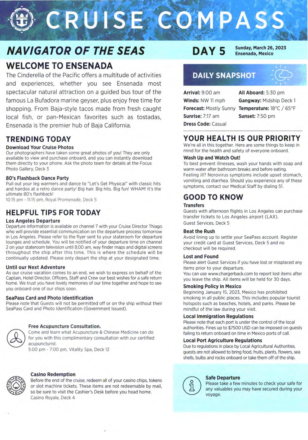 Navigator of the Seas 5-night Cabo and Ensenada Cruise Compass - March 22, 2023