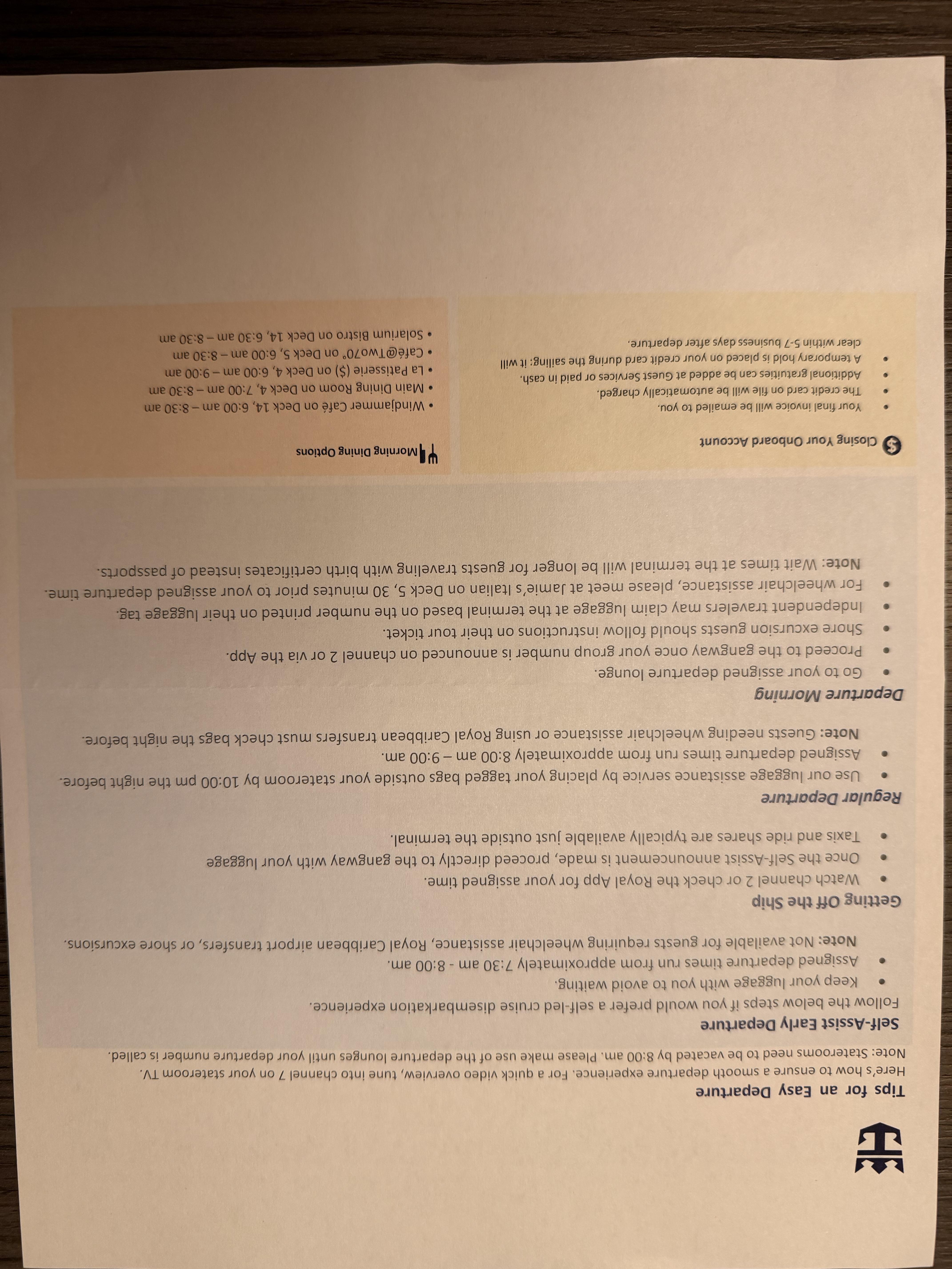 To ensure a smooth disembarkation, keep your airline tickets, passport/proof of citizenship, and medications where you can easily find them, and remember to set aside clothes for departure morning.