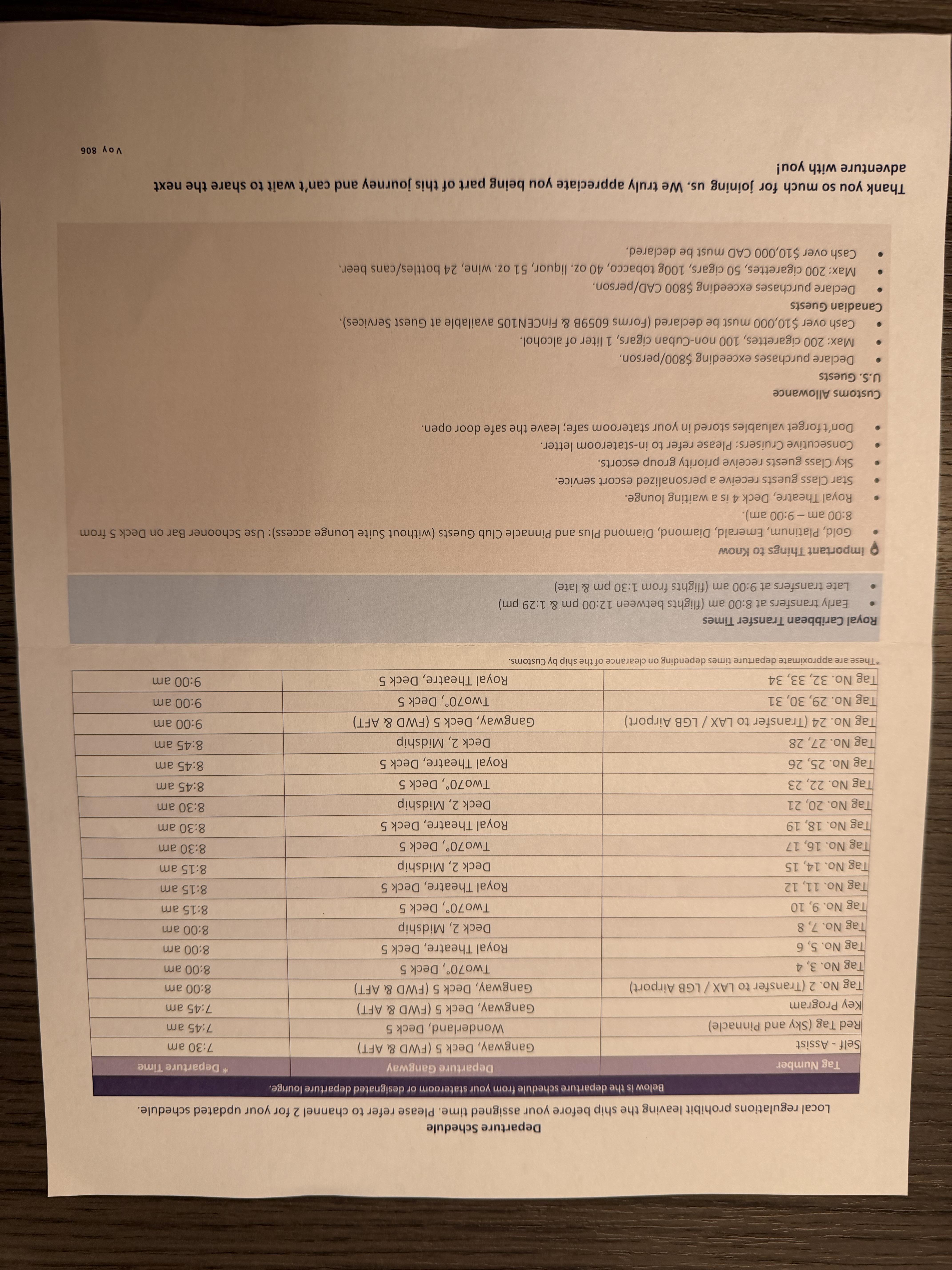 Departure information is available on channel 7 with your Cruise Director Tami, who will provide essential communication on the departure process tomorrow in Los Angeles. Please refer to the flyer sent to your stateroom for departure lounges and schedule. You will be notified of your departure time on channel 2 on your stateroom television until 8:00 am, way finder maps and digital screens throughout the ship after this time. This is where the schedule will be continually updated. Please only depart the ship at your designated time. All Aboard 4:00 pm