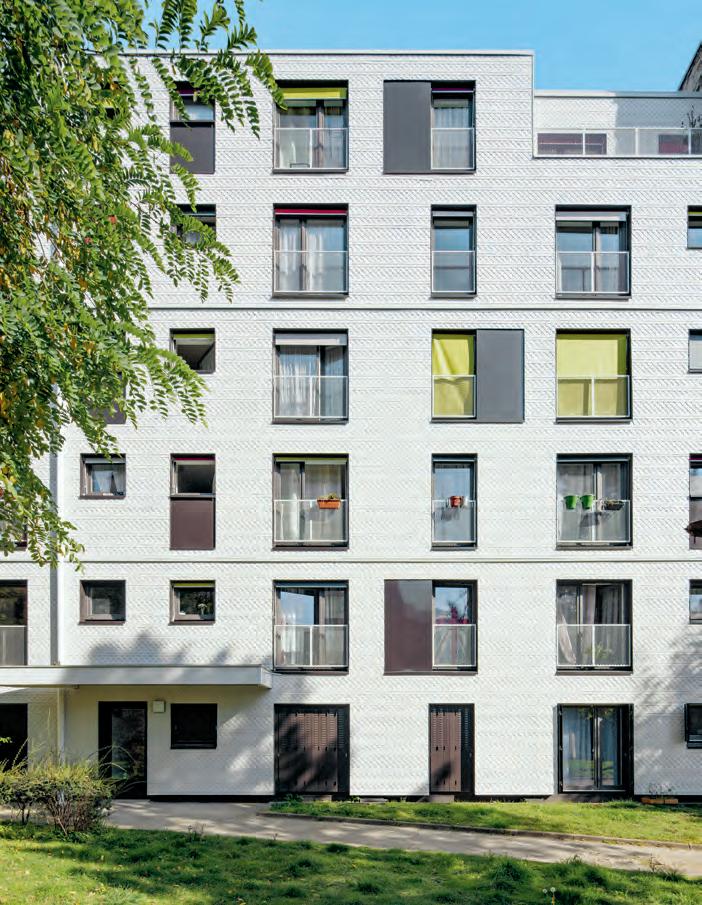 À Paris, dans le 11 e arrondissement, le bureau Croixmariebourdon architectes associés a confectionné un nouvel habit pour un ensemble de deux immeubles à loyers modérés. Les deux immeubles entourent un jardin sur lequel la ville prévoyait à l’origine une construction neuve. Les architectes voulaient une façade adaptée à la fois au neuf et à l’existant et proposèrent de petites plaques de fibres-ciment de différentes couleurs. La ville ne voulut ni de la construction neu ve ni de la façade colorée mais les petits bardeaux demeurèrent.