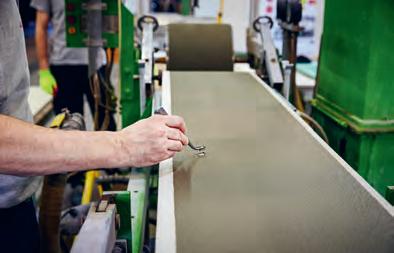 D’abord liquide, puis solide À Niederurnen, le personnel de Swisspearl fait tourner deux grosses machines, parfois en 24 h sur 24 selon le carnet de commandes, pour fabriquer des plaques en fibres-ciment. Au départ, le produit est une suspension aqueuse de ciment, fibres et additifs. Un tapis de feutre sans fin est plongé dans ce bain. Les matières solides se déposent sur celui-ci en couches minces que récupère ensuite un rouleau. Quand la plaque a l’épaisseur voulue, les couches superposées sont détachées du rouleau, déposées sur un plan de travail sous forme de plaques souples brutes, puis découpées grossièrement. La pile qui se forme au fur et à mesure passe ensuite dans une presse qui permet d’extraire l’essentiel de l’eau encore présente. Un contrôle est alors effectué, puis les plaques brutes sont envoyées au séchoir. Si nécessaire, un revêtement y est alors appliqué, le séchage se poursuit et les plaques arrivent enfin au conditionnement, où elles sont découpées aux différents formats. La production des plaques ondulées et des produits pour toiture suit le même procédé.