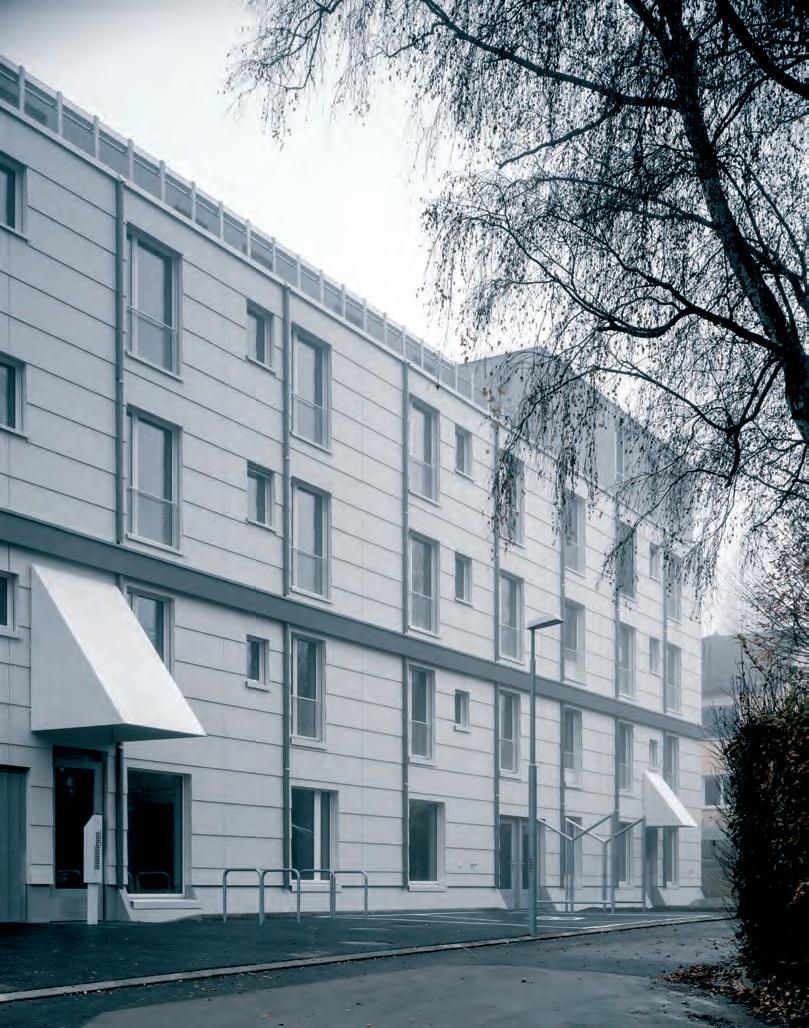 et Thomas Padmanabhan. Sur l’immeuble du Waldmeisterweg, ils ont prévu des lésènes de bois qui pourront être remplacées séparément des plaques en fibres-ciment, permettant ainsi un vieillissement distinct des matériaux.