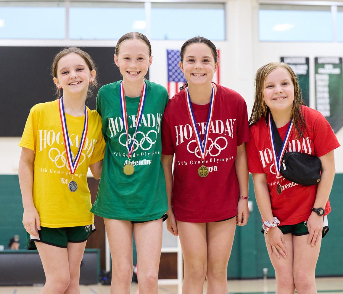 During the Fifth Grade Olympics, students learn about the Olympic values and participate in opening and closing ceremonies and various athletic events. The girls are divided into countries, and medals are given for basketball, field hockey, rowing, table tennis, soccer, swimming, and track and field.
