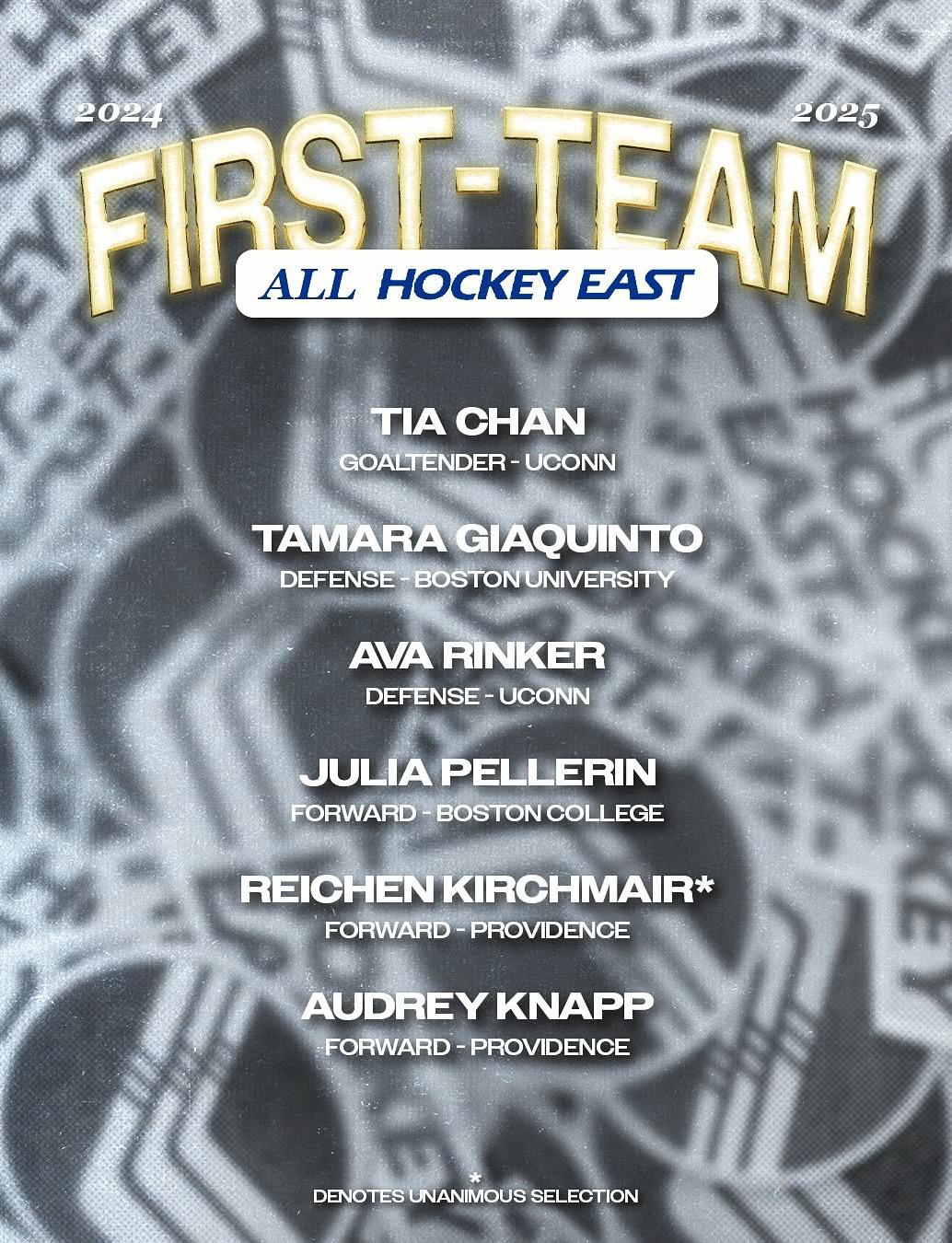 The Hockey East All-Tournament Team recognized four Terriers, Sydney Healey (F), Riley Walsh (F), Tamara Giaquinto (D), and Callie Shanahan (G) and two Huskies, Skylar Irving (F) and Jules Constantinople (D), for their outstanding performances throughout the tournament.