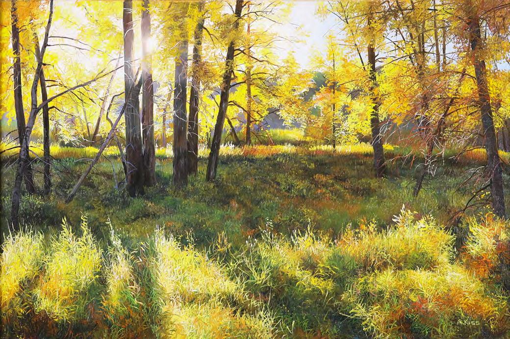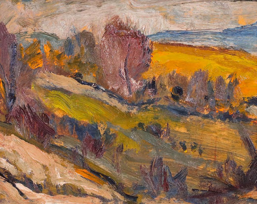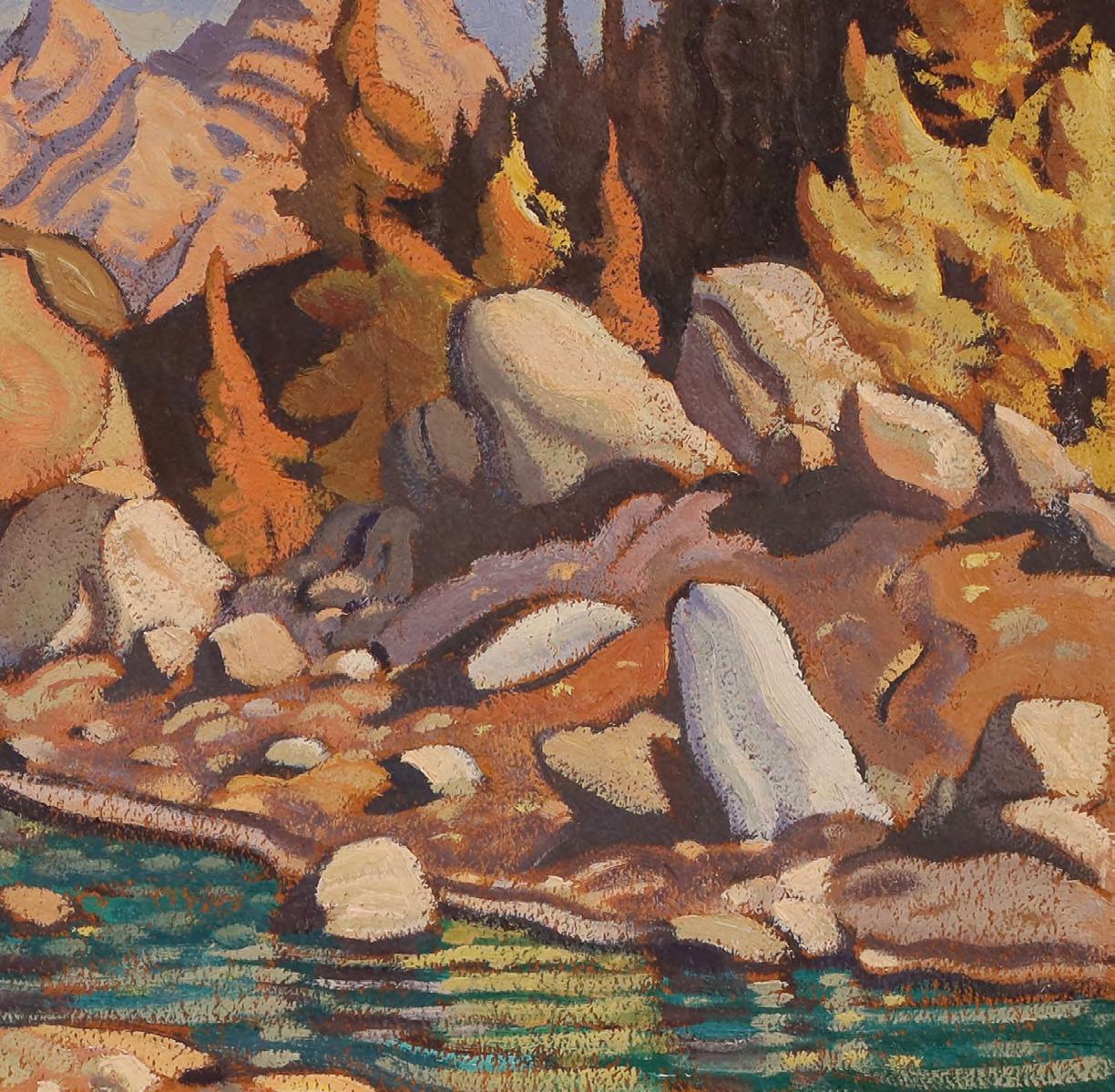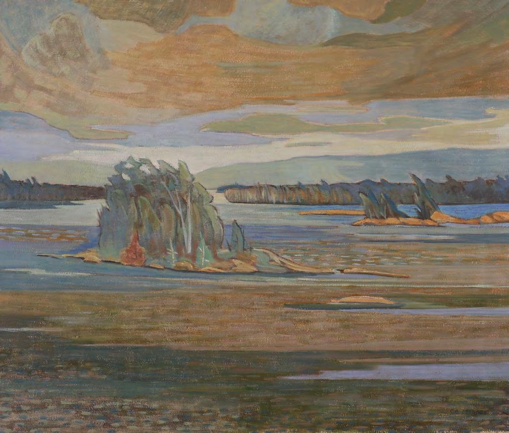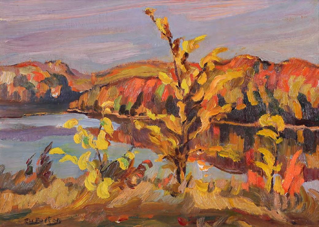 AUTUMN SHORE WITH LARCH ABOVE oil