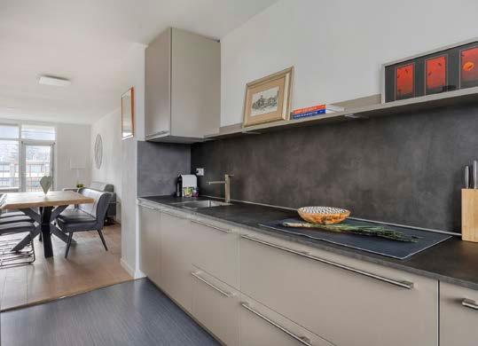 De open keuken grenst direct aan de woonkamer en is een echte eyecatcher: strak afgewerkt, modern en voorzien van hoogwaardige inbouwapparatuur. De keuken is een droom voor culinaire liefhebbers.