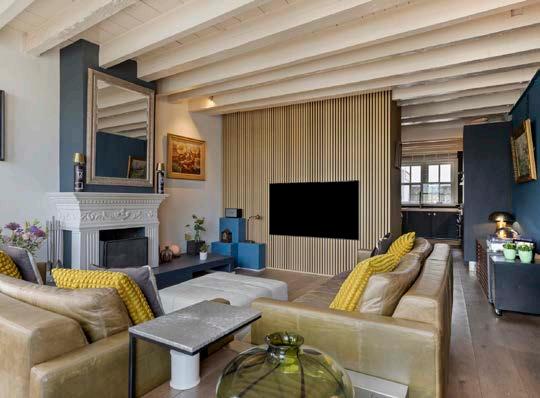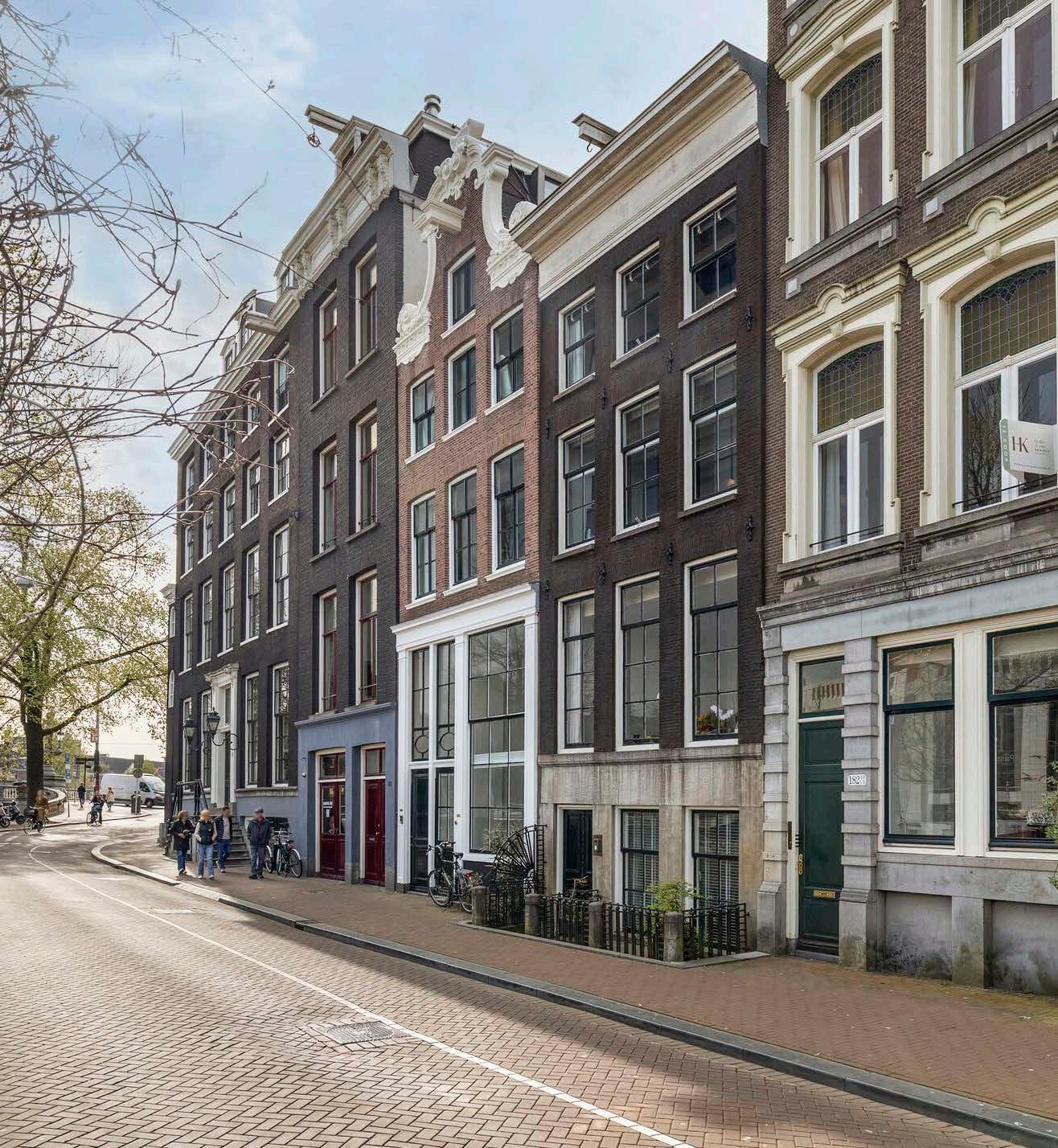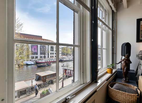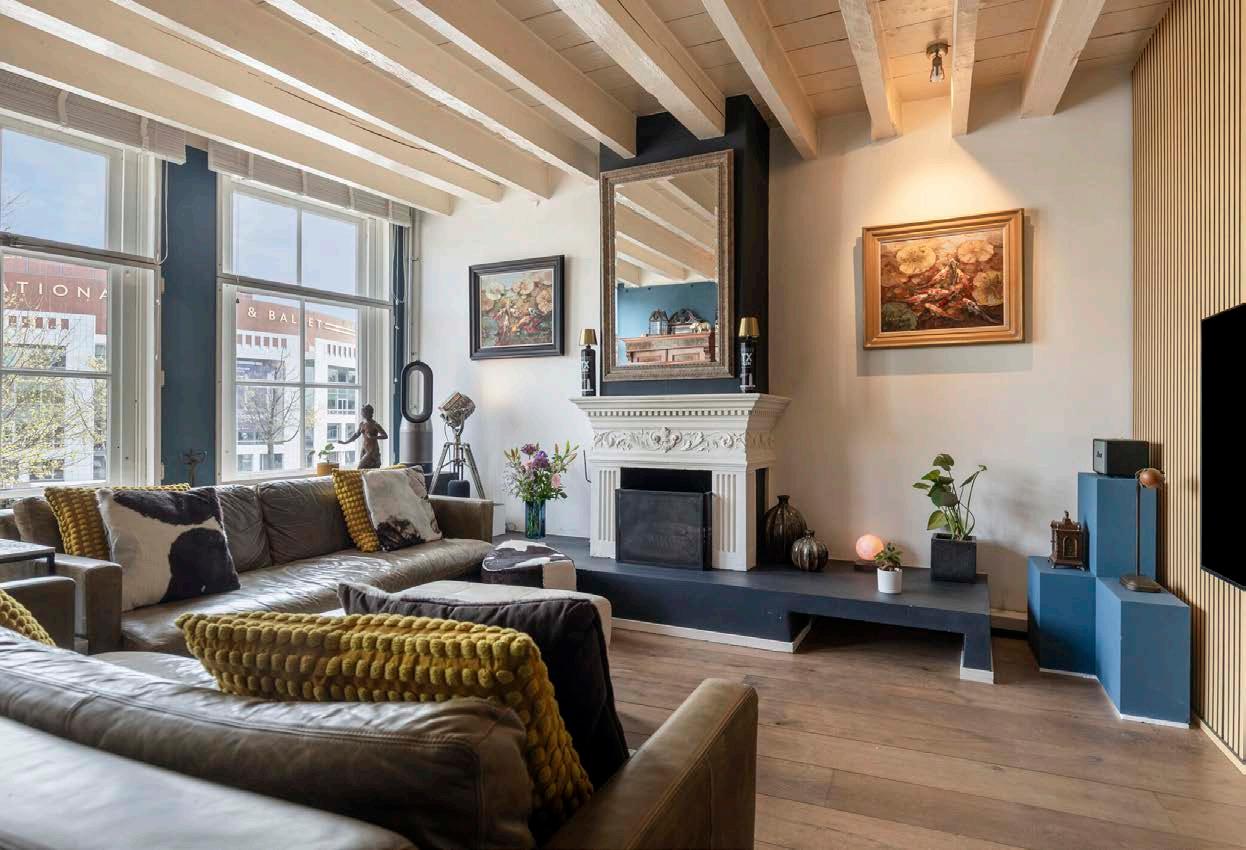 Een fijne, open ruimte met genoeg plek voor een grote eettafel én een gezellige zithoek bij de open haard. De op maat gemaakte schouw en de drie grote ramen aan de voorzijde zorgen voor een warm en sfeervol geheel. Door de voorzetramen is het opvallend stil binnen. Het uitzicht over de Amstel richting de Stopera is simpelweg fantastisch. In de zomer zie je bootjes voorbijvaren; in de winter biedt het bevroren water een bijna magisch uitzicht.